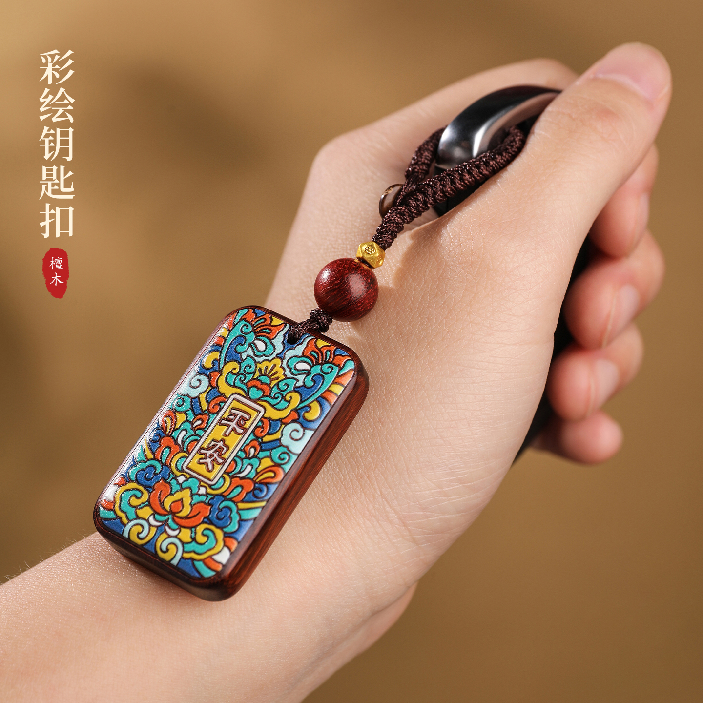 高档檀木汽车钥匙扣2025新款 防丢车钥匙扣挂绳挂饰 平安无事牌男士