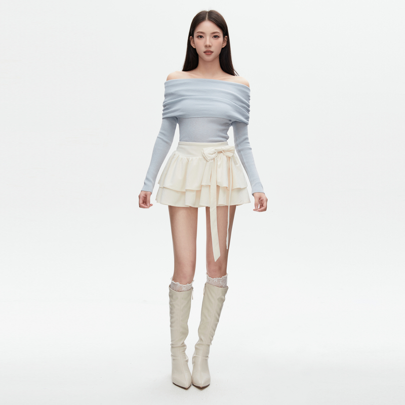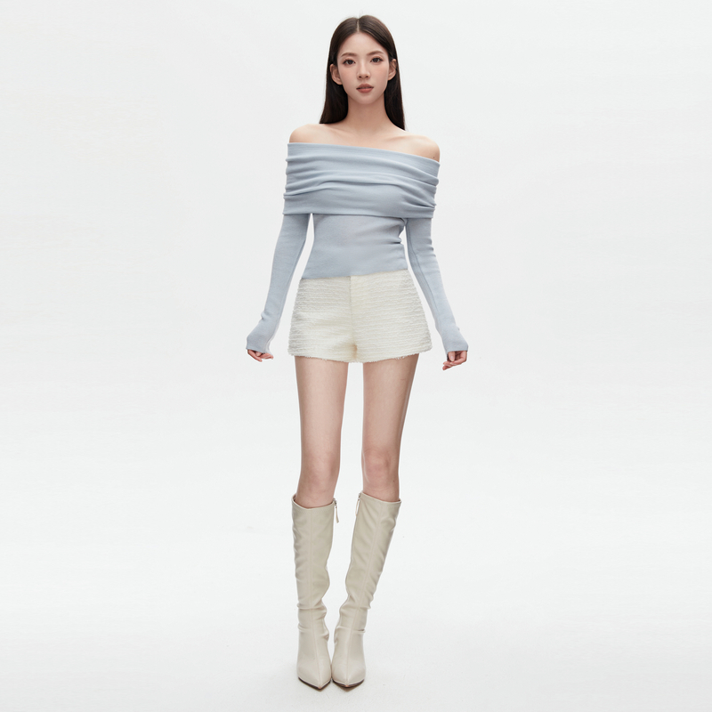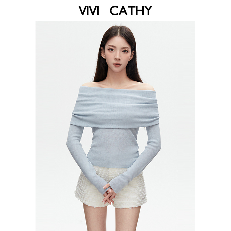 VIVICATHY2025秋纯欲锁骨一字肩针织衫 女蓝色温柔风打底毛衣上衣