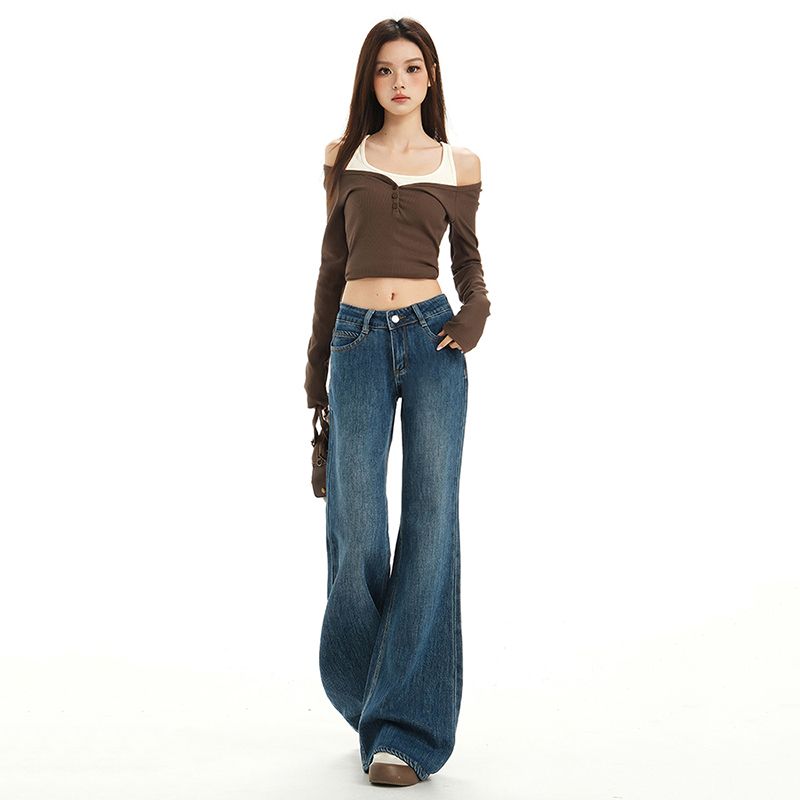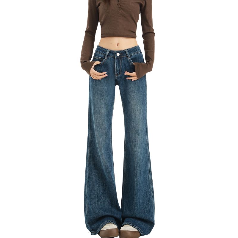 高腰显瘦百搭休闲阔腿裤 复古港风丹宁蓝阔腿微喇牛仔裤 女秋冬爆款
