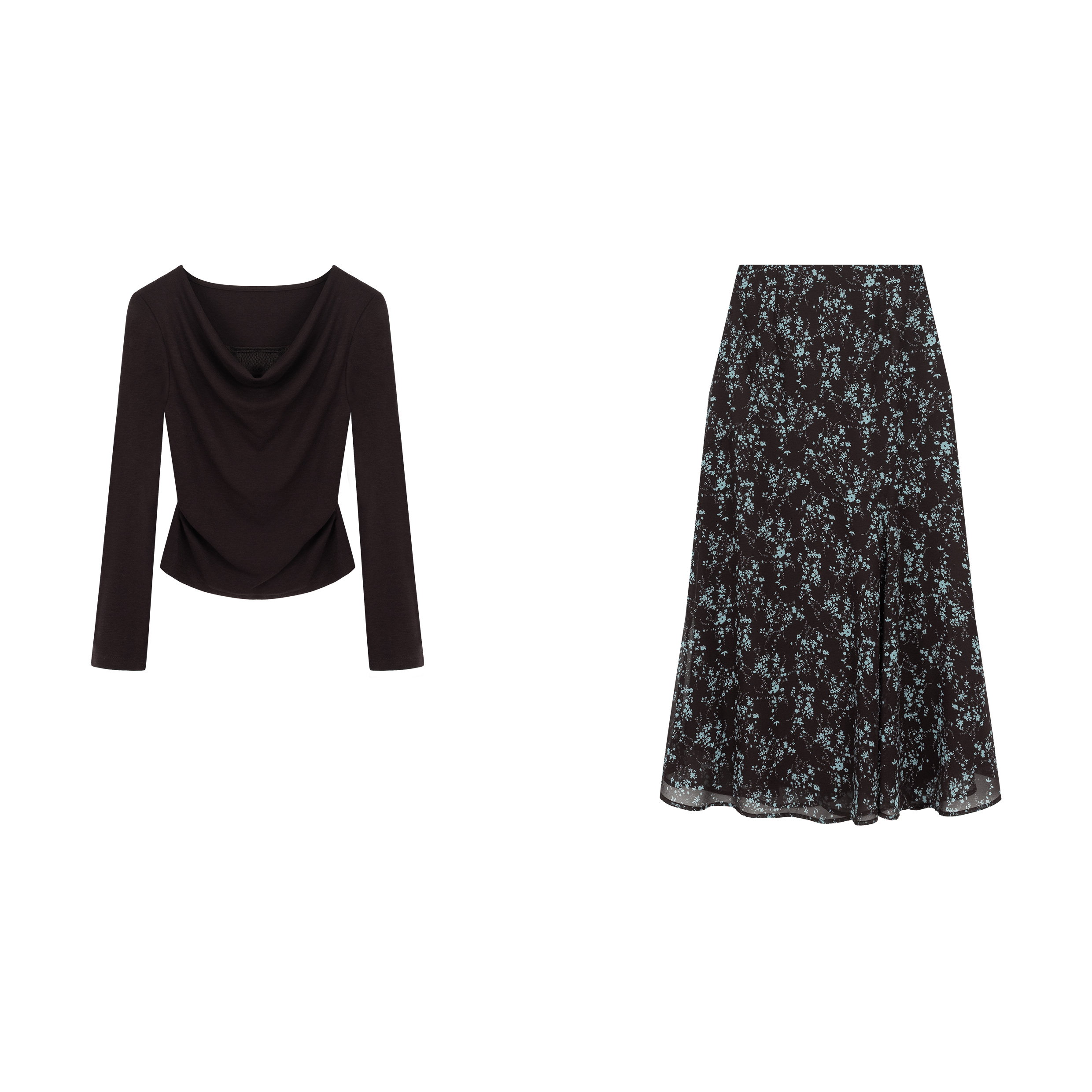 旧诗蓝调 上衣印花半身裙套装 秋季 复古紫色V领长袖 女 新款 乔拉