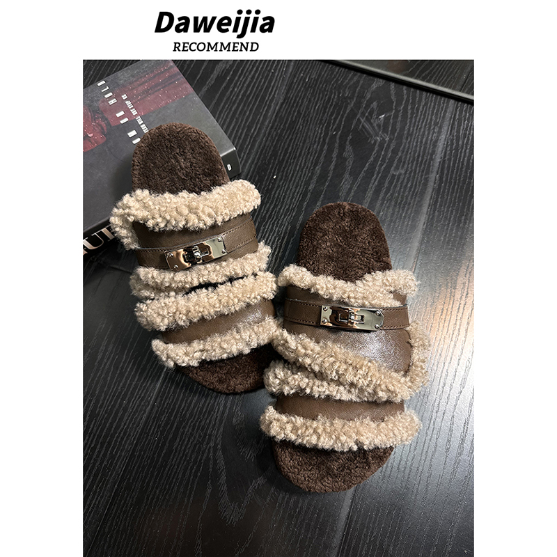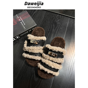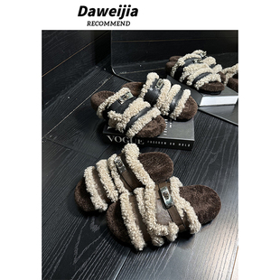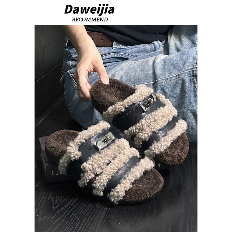潮 网红厚底懒人露趾勃肯毛毛鞋 欧货软皮羊羔毛拖鞋 女外穿2025新款