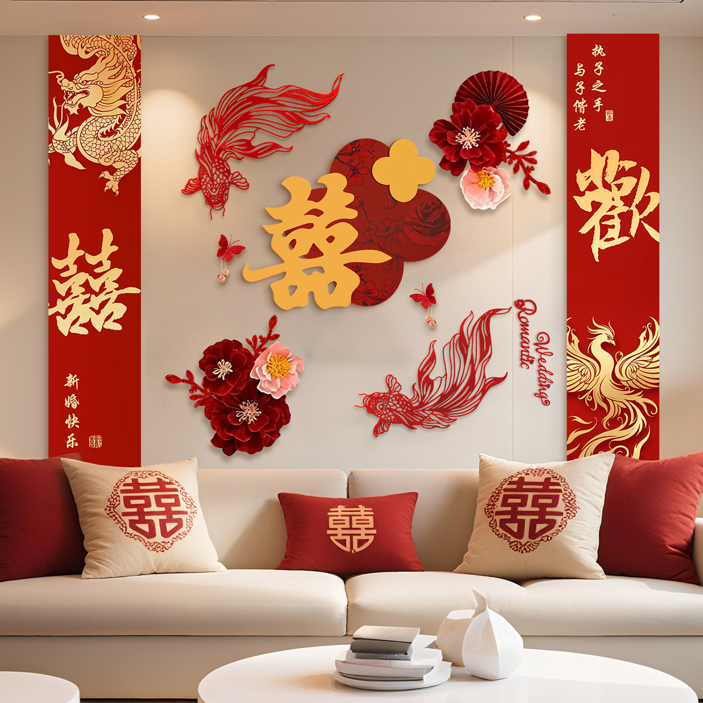 婚房布置玄关背景墙装 饰结婚礼新房客厅走廊墙男女方房间拉花高级