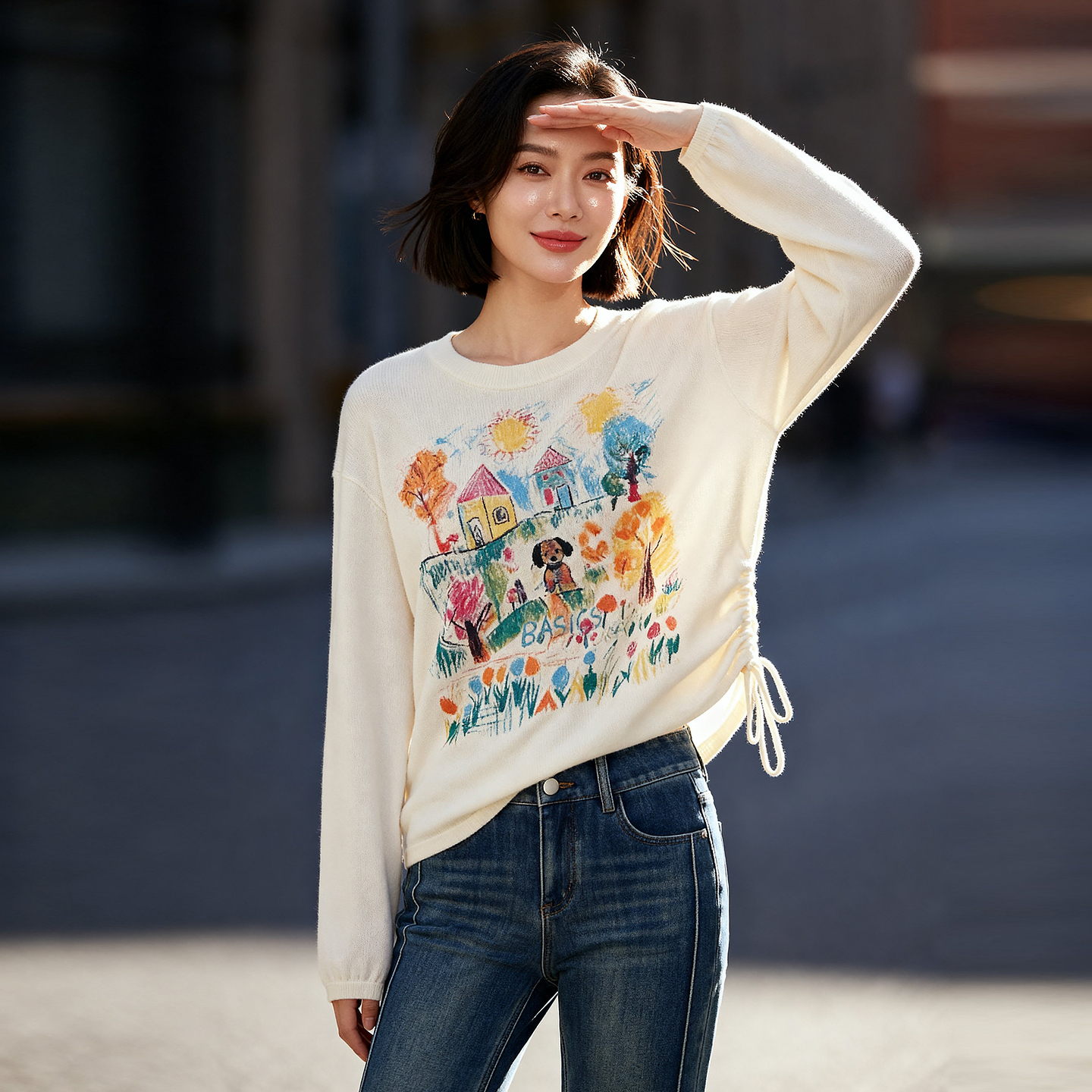 2025秋季 百家好休闲针织衫 涂鸦彩绘侧边抽绳套头上衣 House Basic