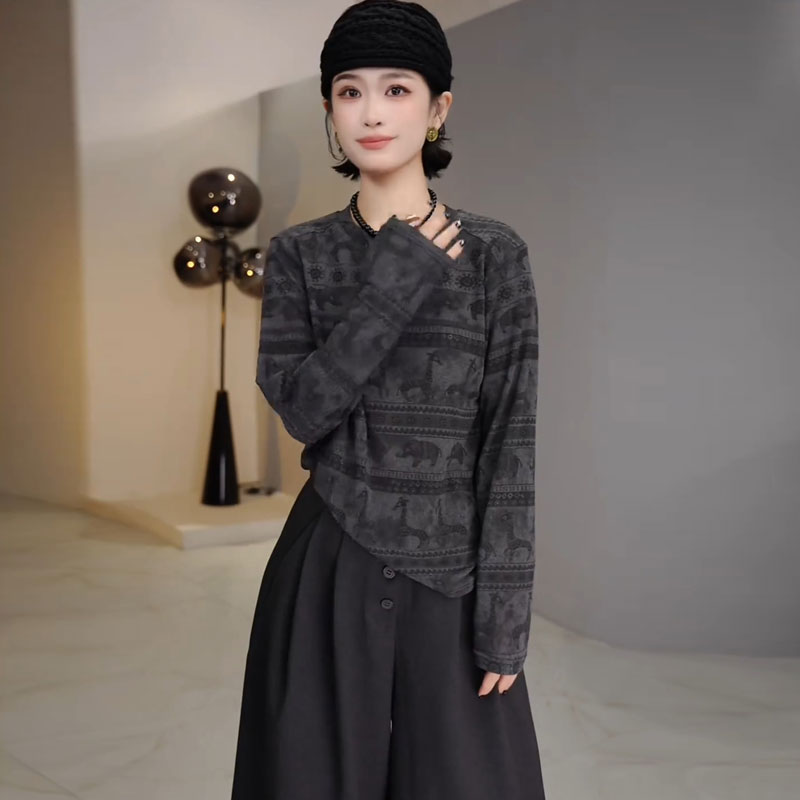 小众套装 U领丝绒马甲叠穿套装 女秋新款 T恤 圆领印花长袖 减龄时尚