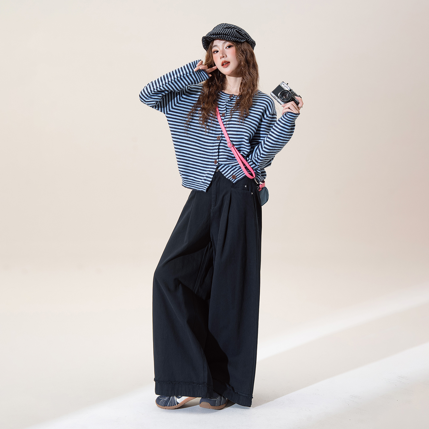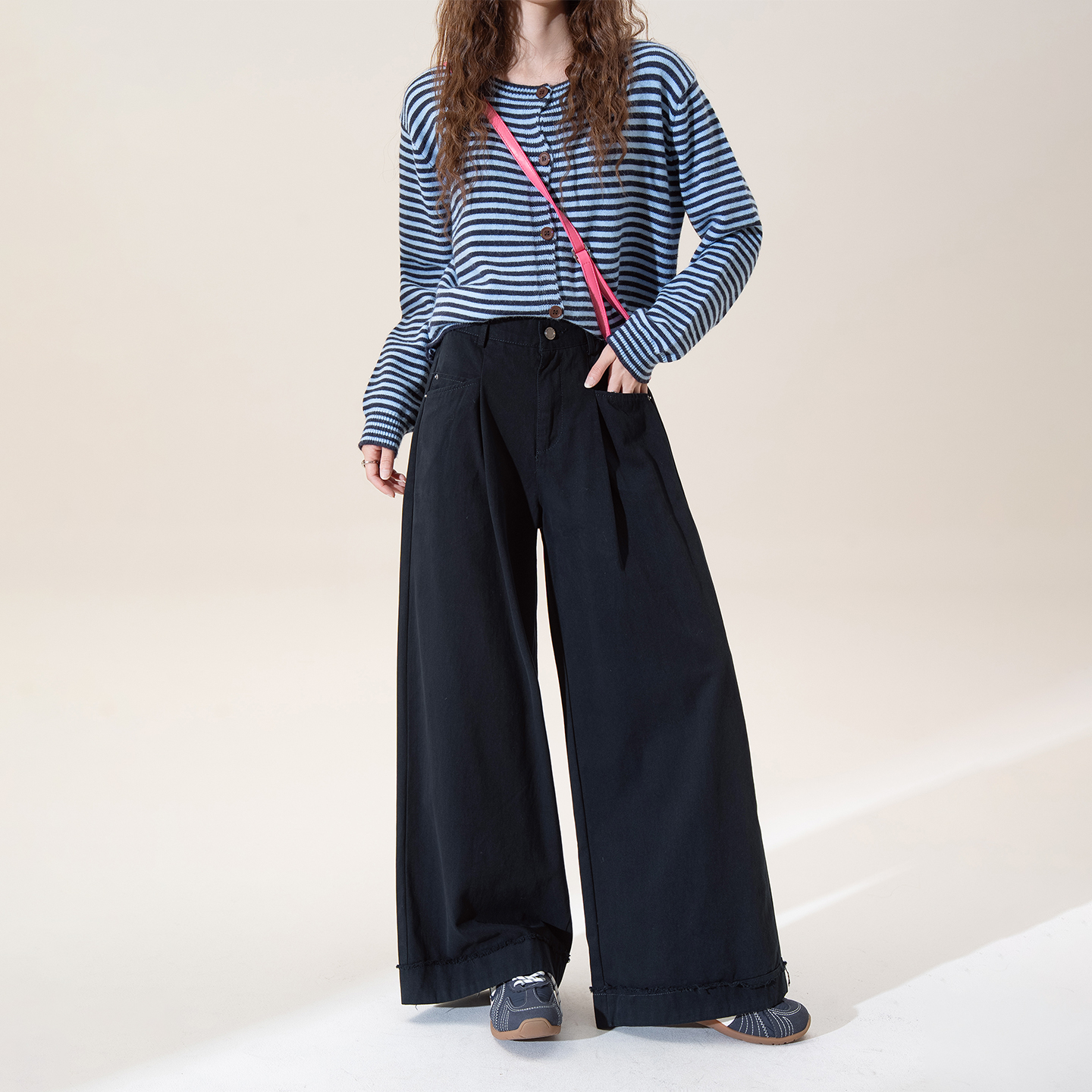 通勤简约百搭宽松垂感直筒长裤 新款 子 女秋季 藏青色高腰阔腿休闲裤
