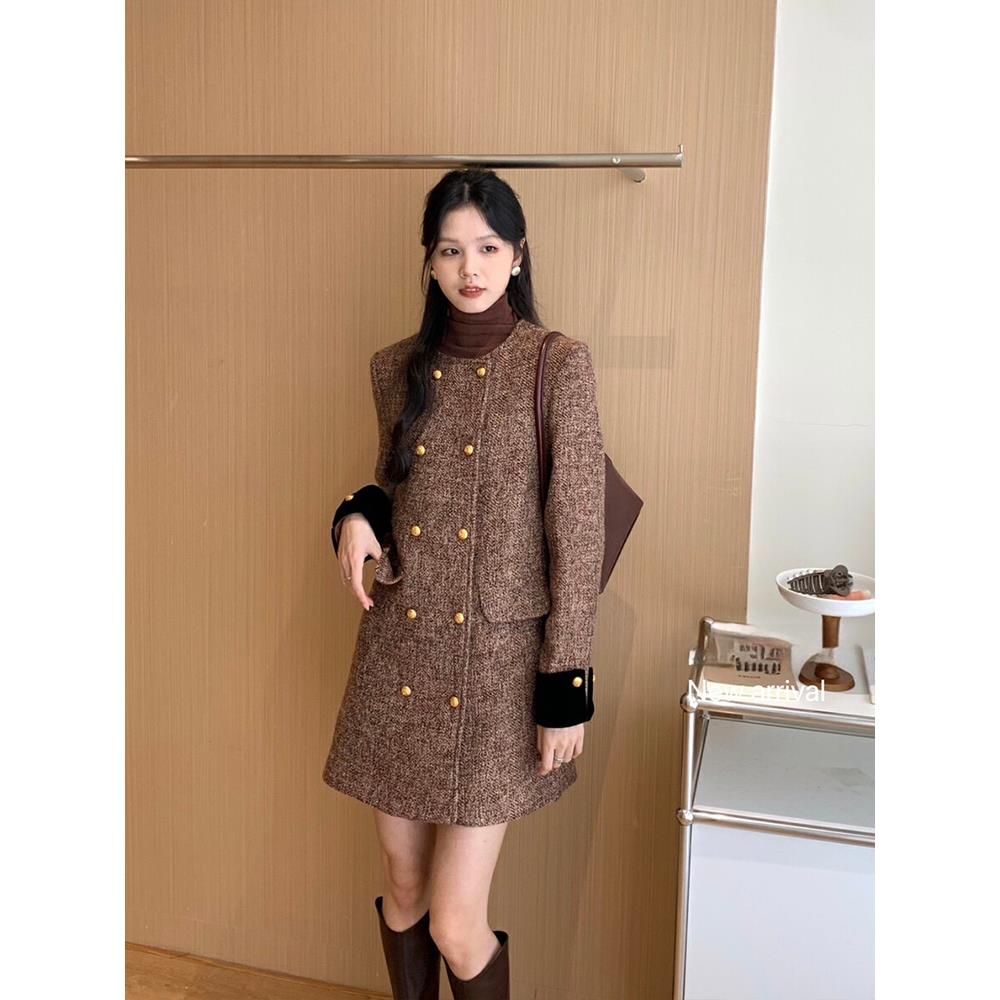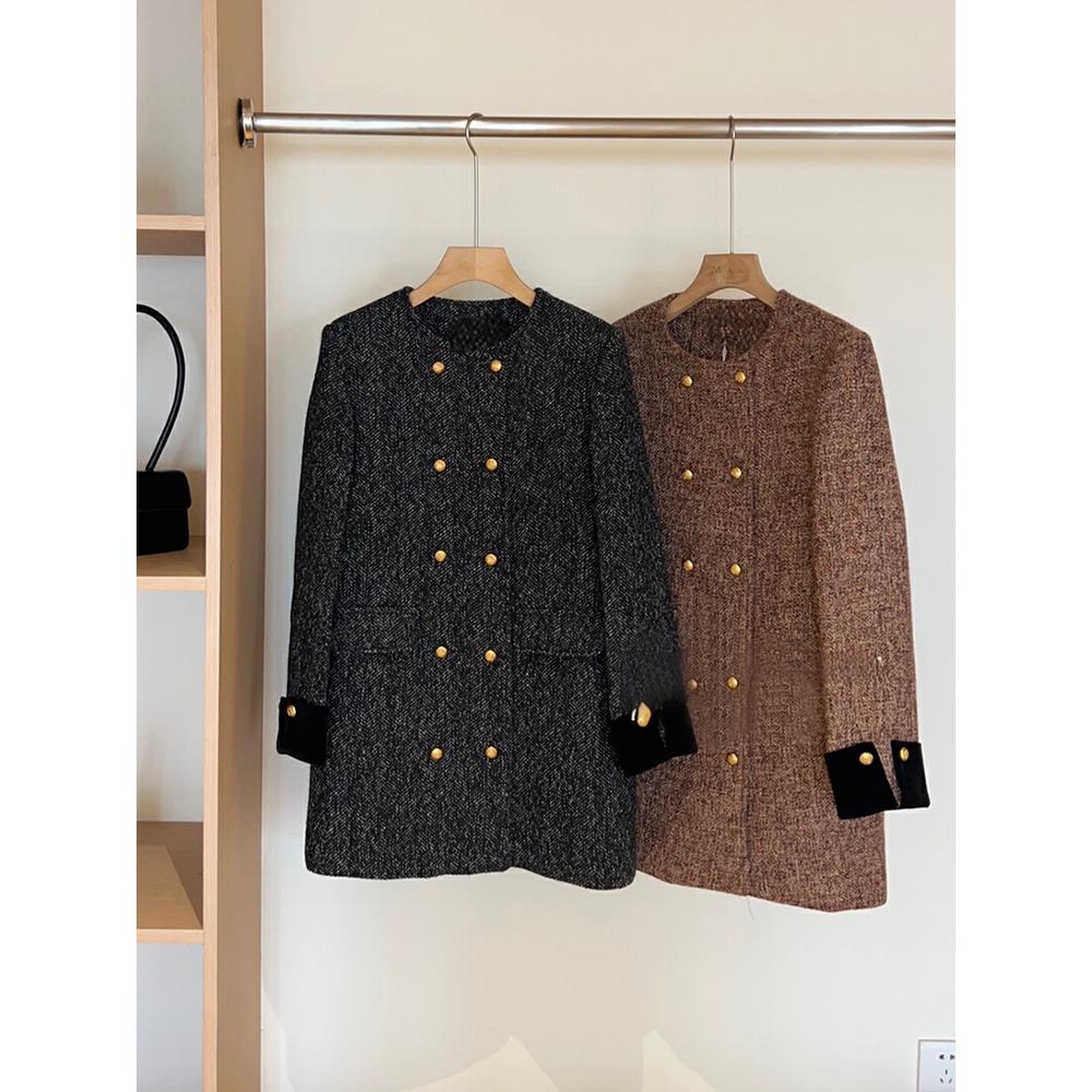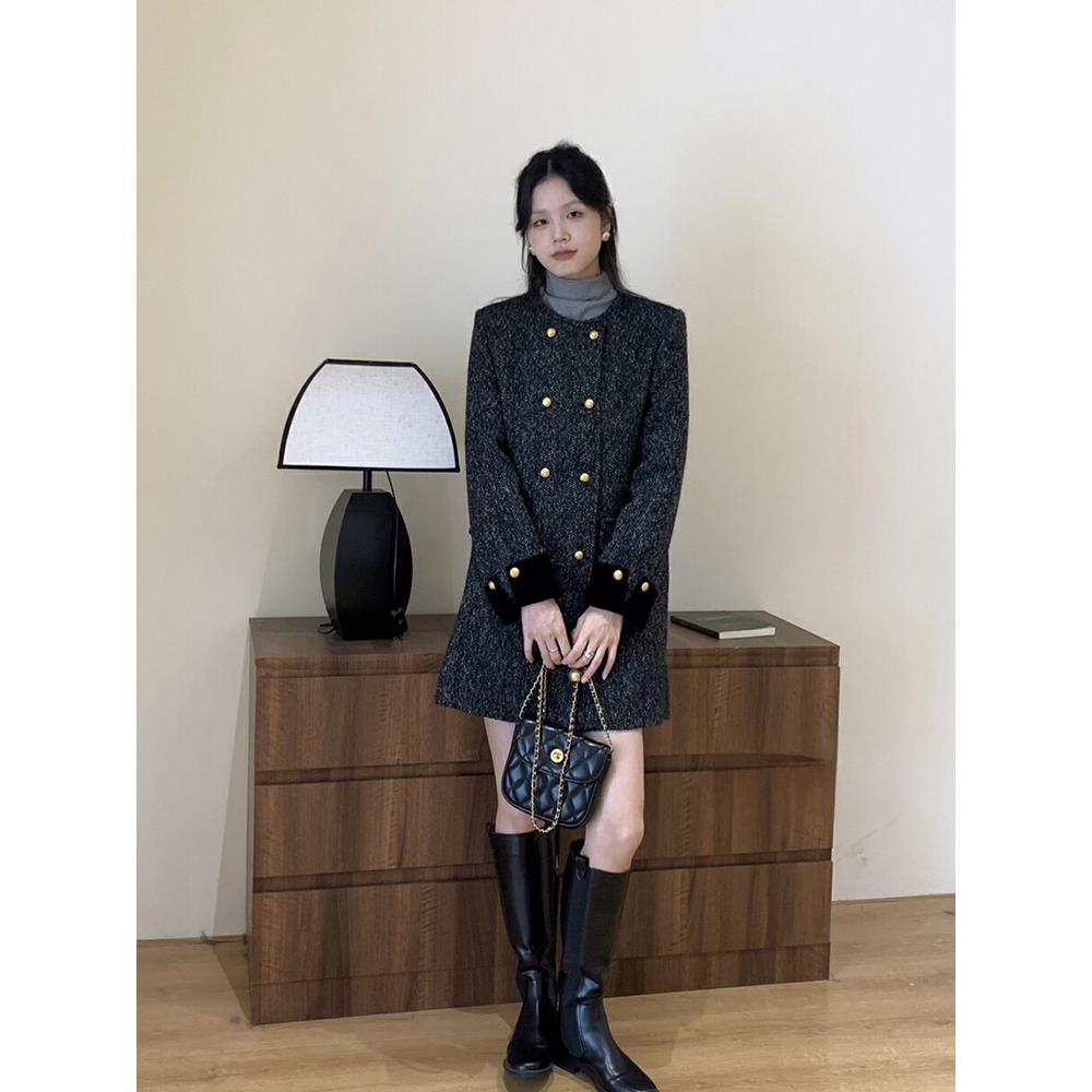 爵莱菲大码 复古小香风双排扣连衣裙女秋冬高级感气质圆领显瘦 法式