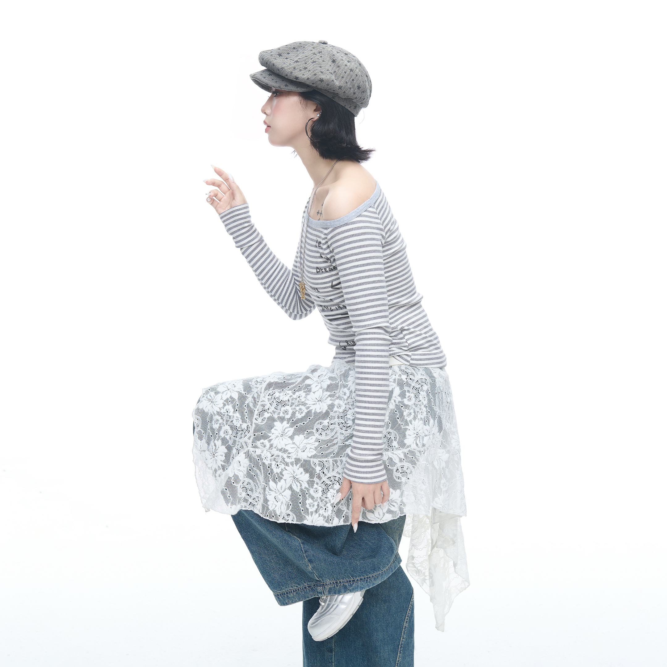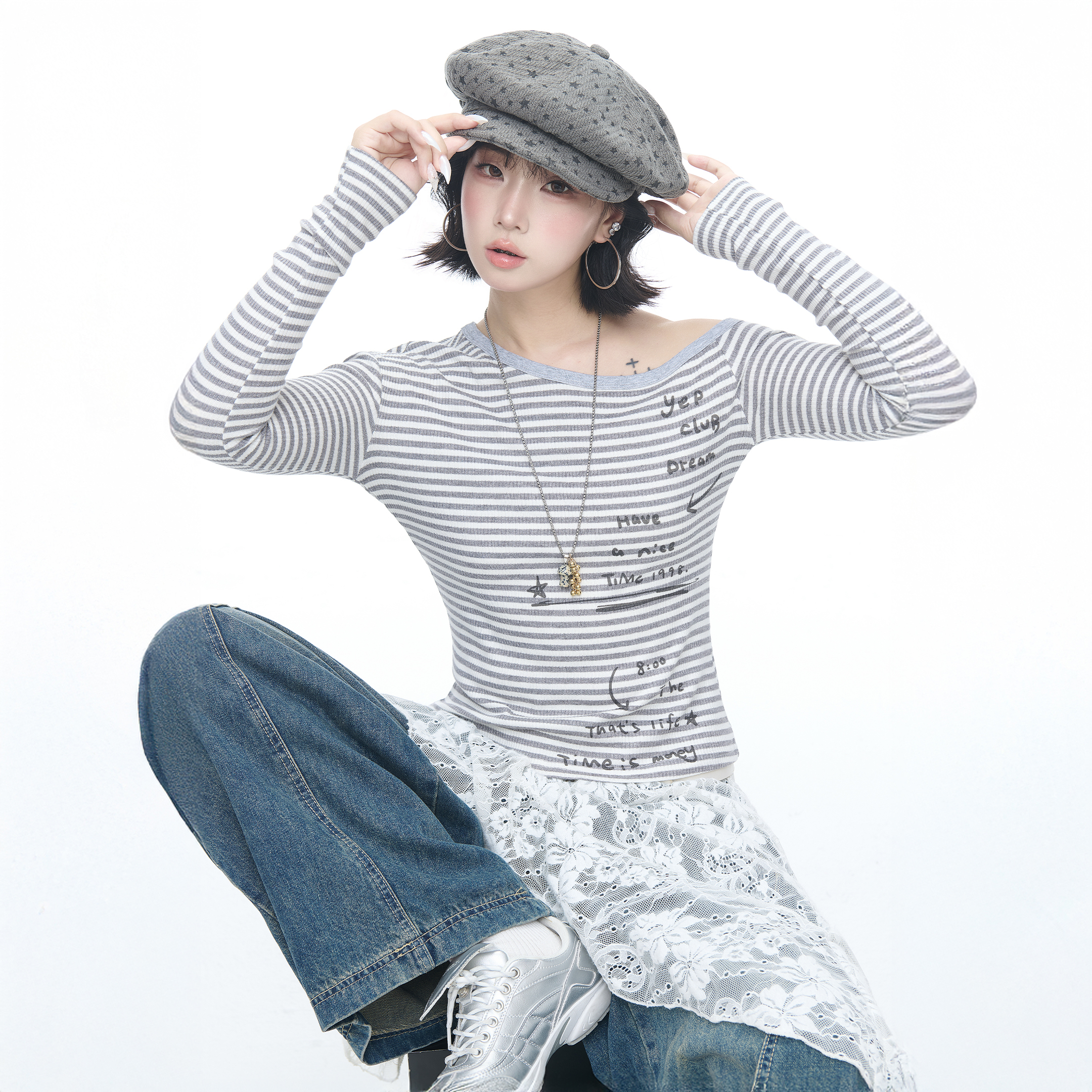 新款 美式 T恤女秋季 条纹长袖 露肩显瘦上衣 辣妹风涂鸦印花斜肩修身
