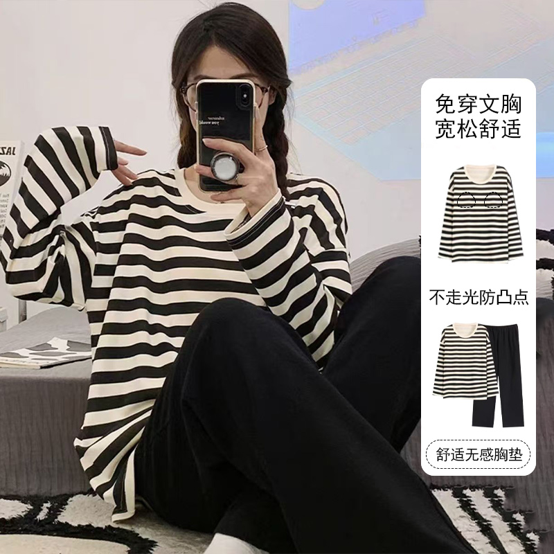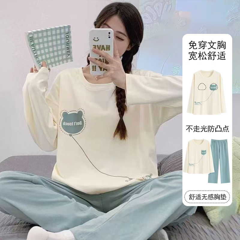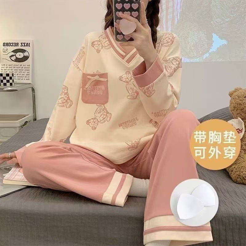 长裤 带胸垫女长袖 圆领女可外穿睡衣 可爱棉家居服套装 睡衣卡通长裤