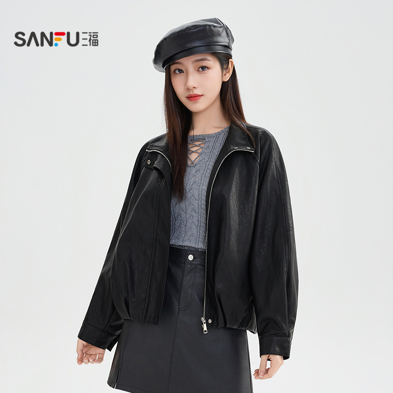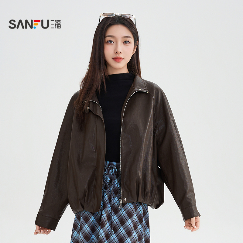 511310 简约翻领松紧摆宽松软皮衣夹克女装 三福外套女2025新款 冬季