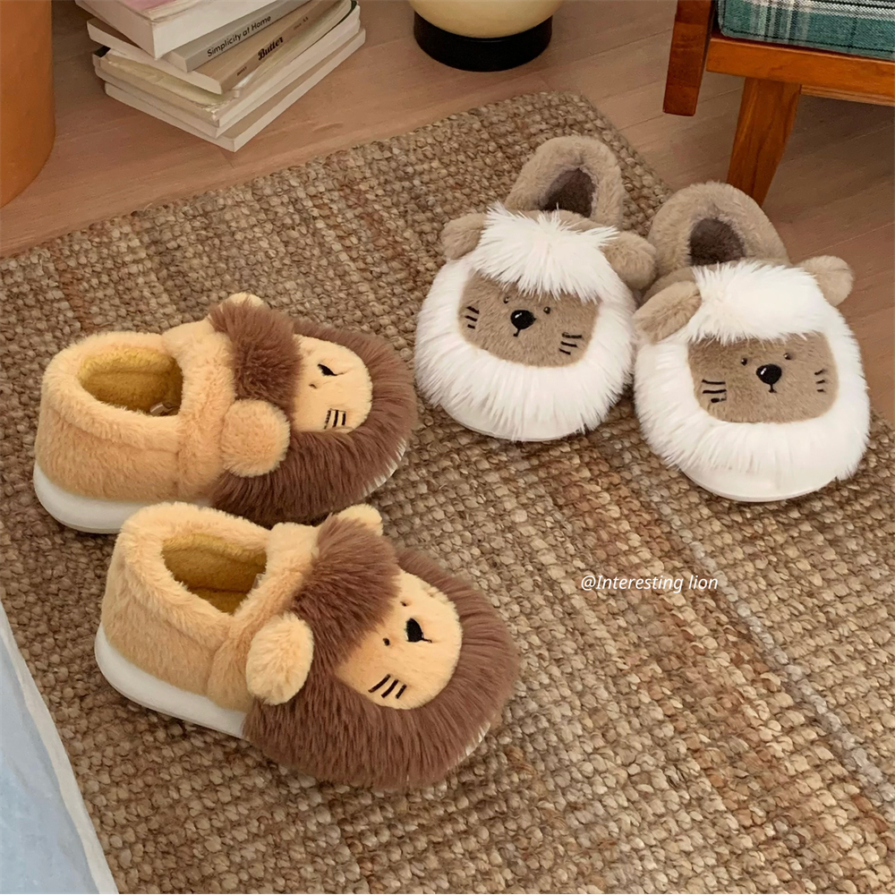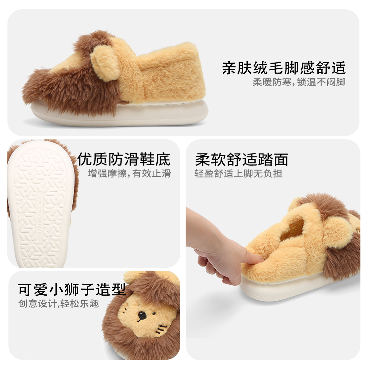 男女 冬包跟保暖舒适毛毛鞋 细细条 情侣防滑居家趣味小狮子棉拖鞋