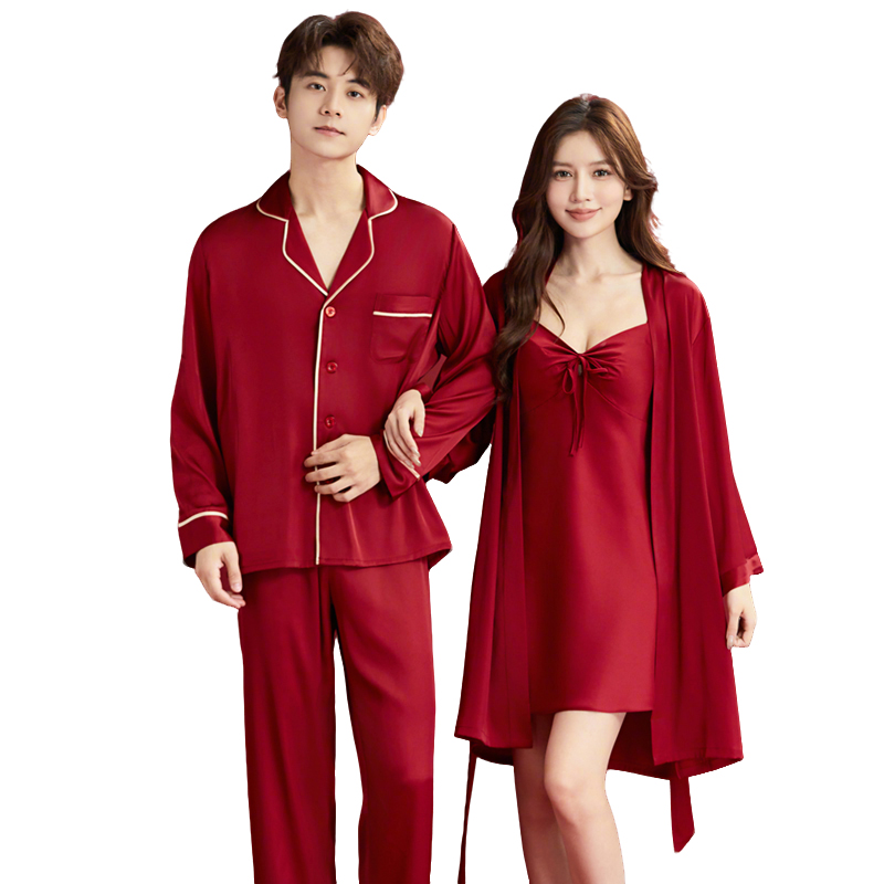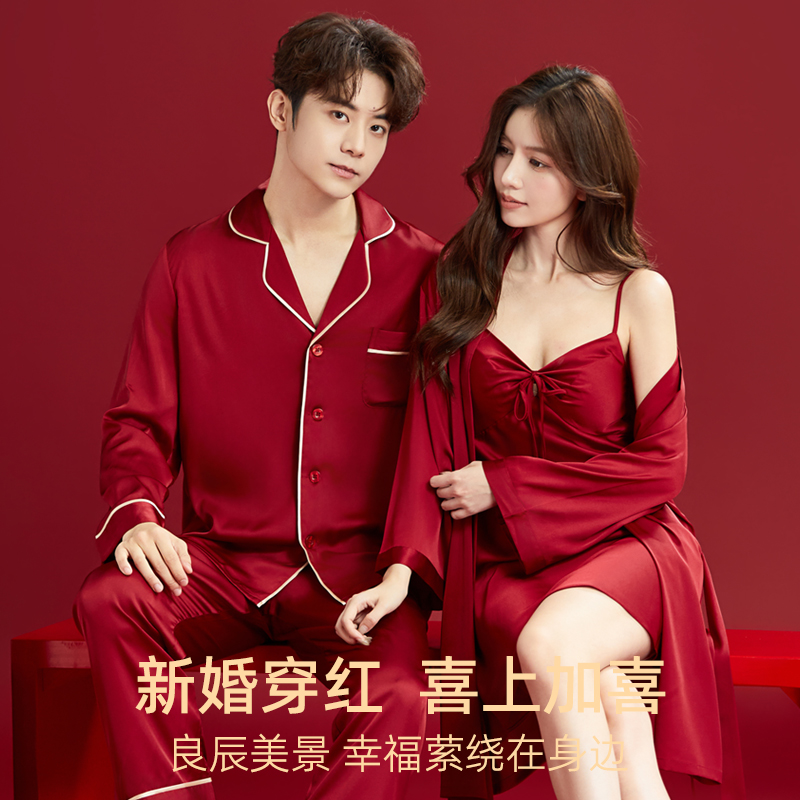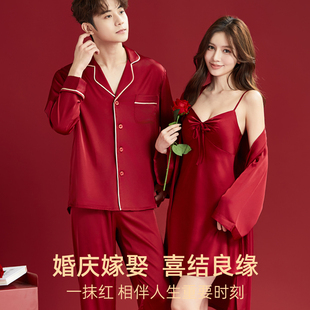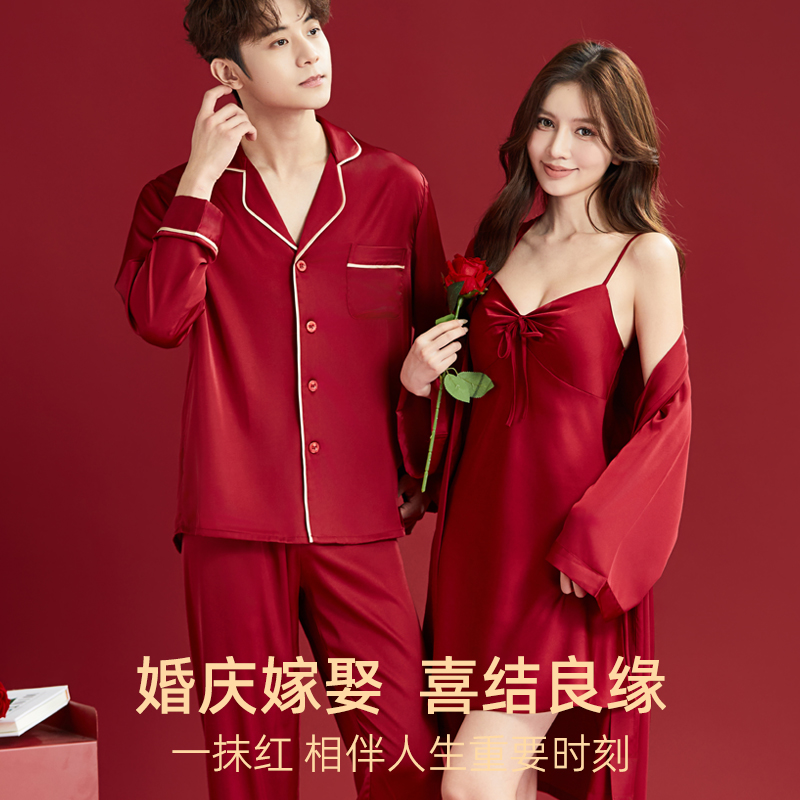 一对冰丝一男一女新郎新娘大码 2套红色睡衣结婚新婚情侣套装 拖鞋