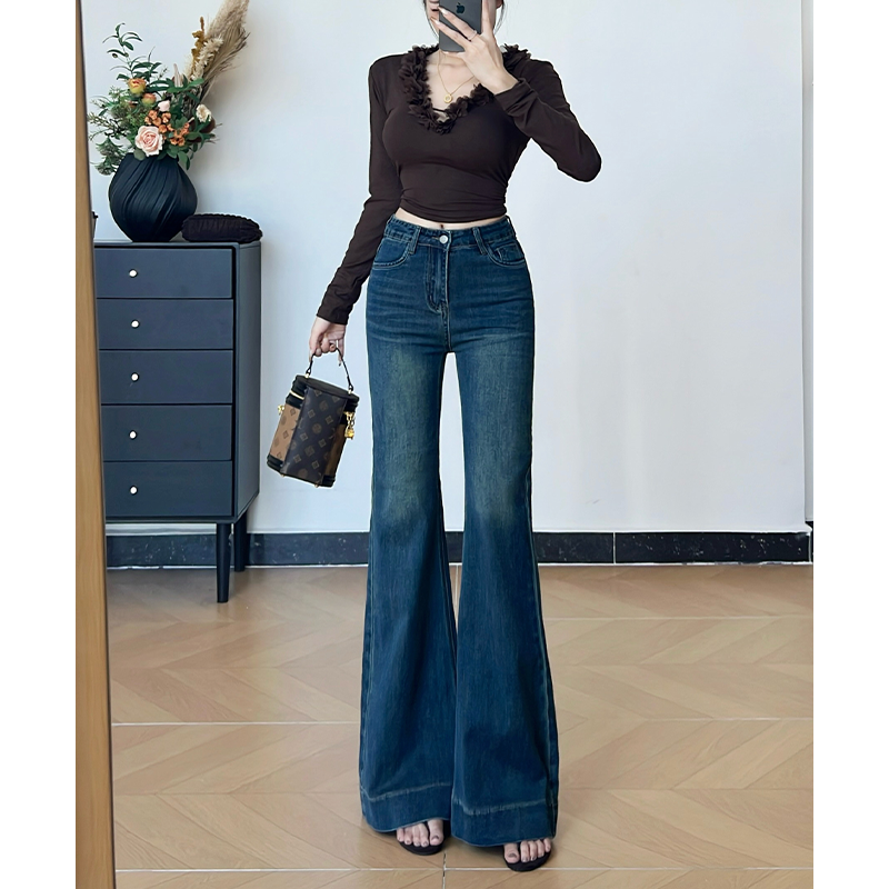 女气质显瘦不贴腿微喇长裤 乔栈秋冬新款 复古百搭设计感喇叭牛仔裤