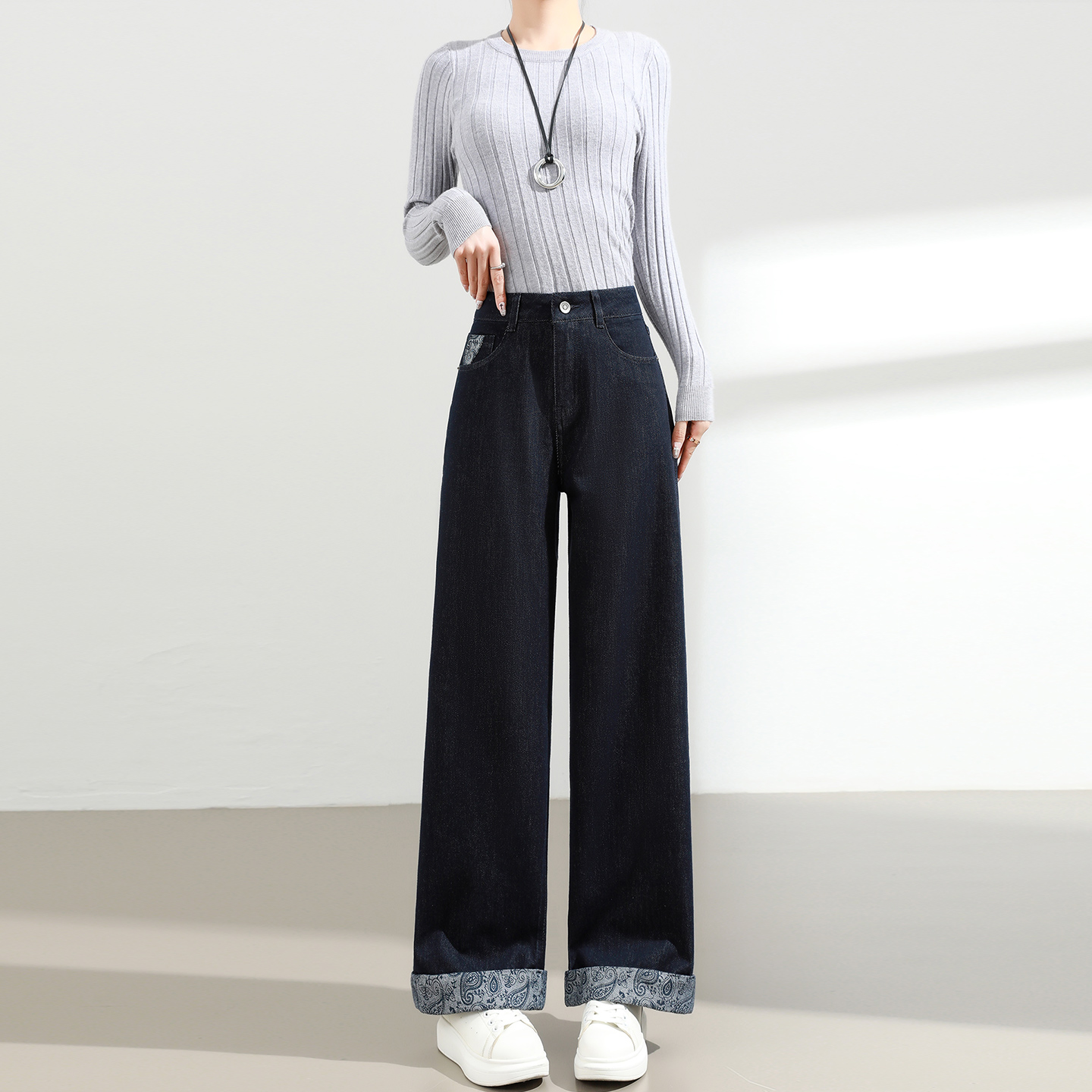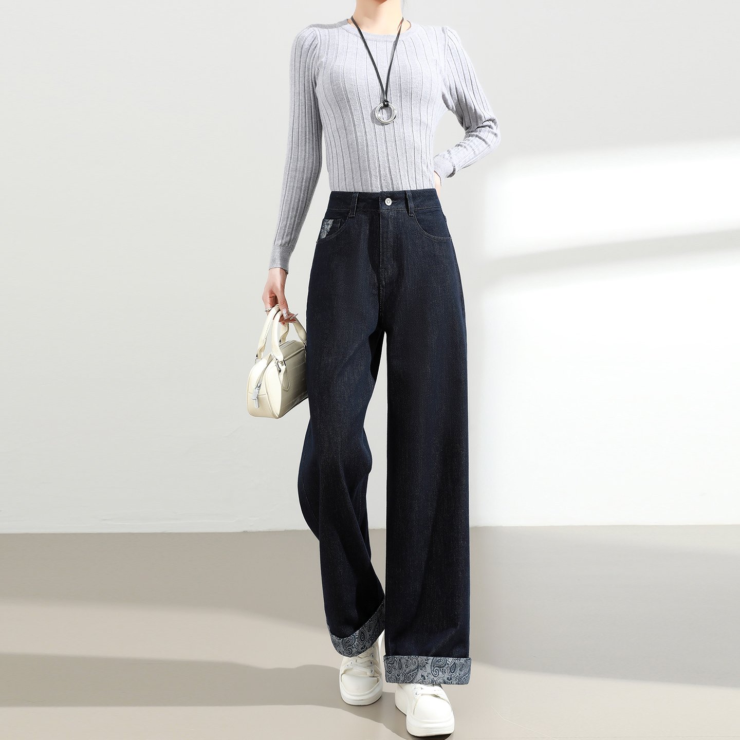 秋40713203 女直筒长裤 艾诺丝雅诗 新疆长绒棉复古高腰阔腿牛仔裤