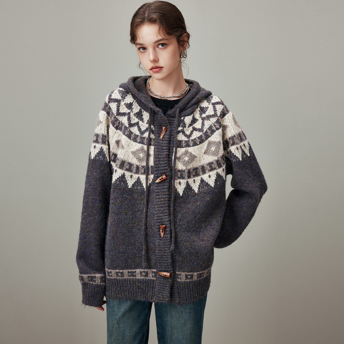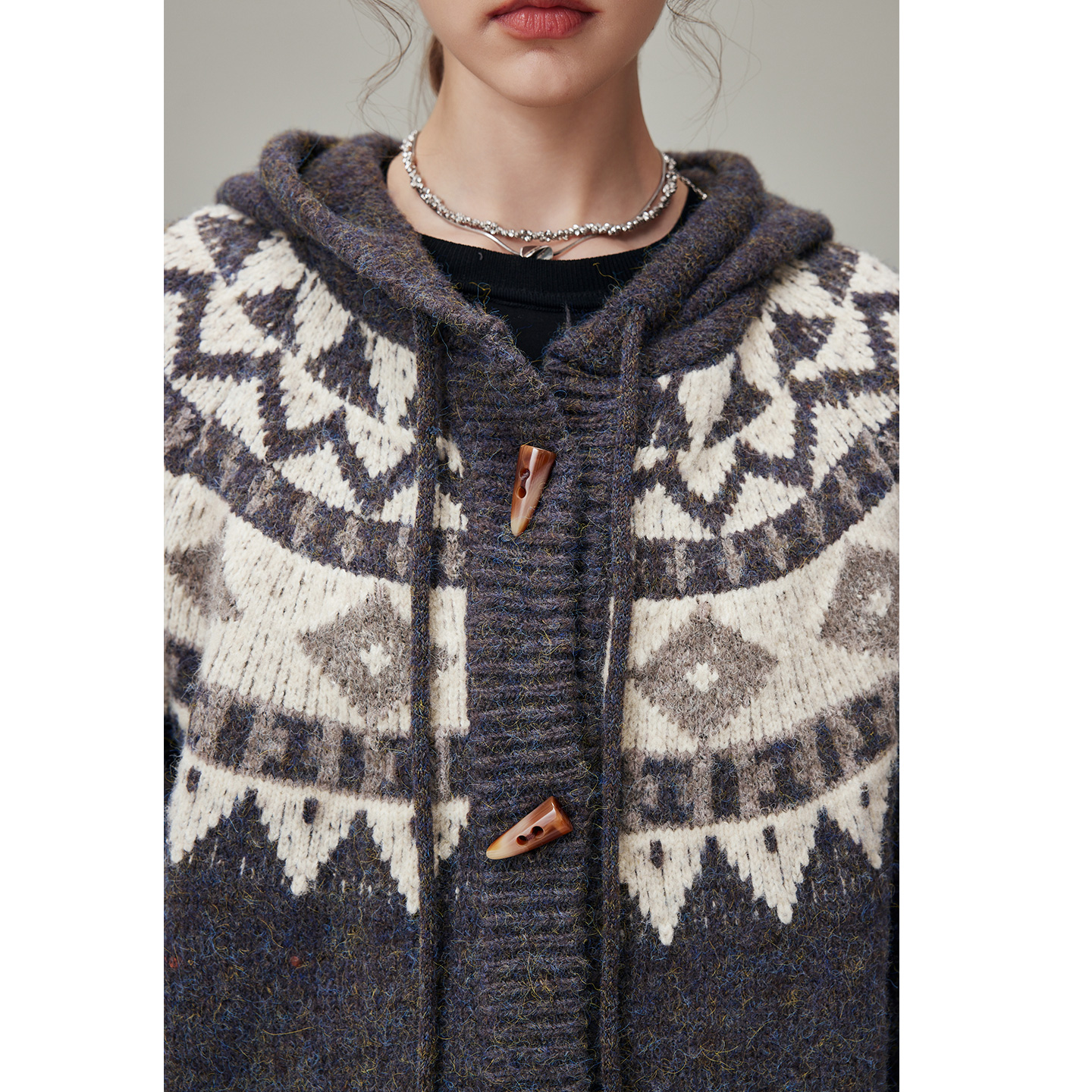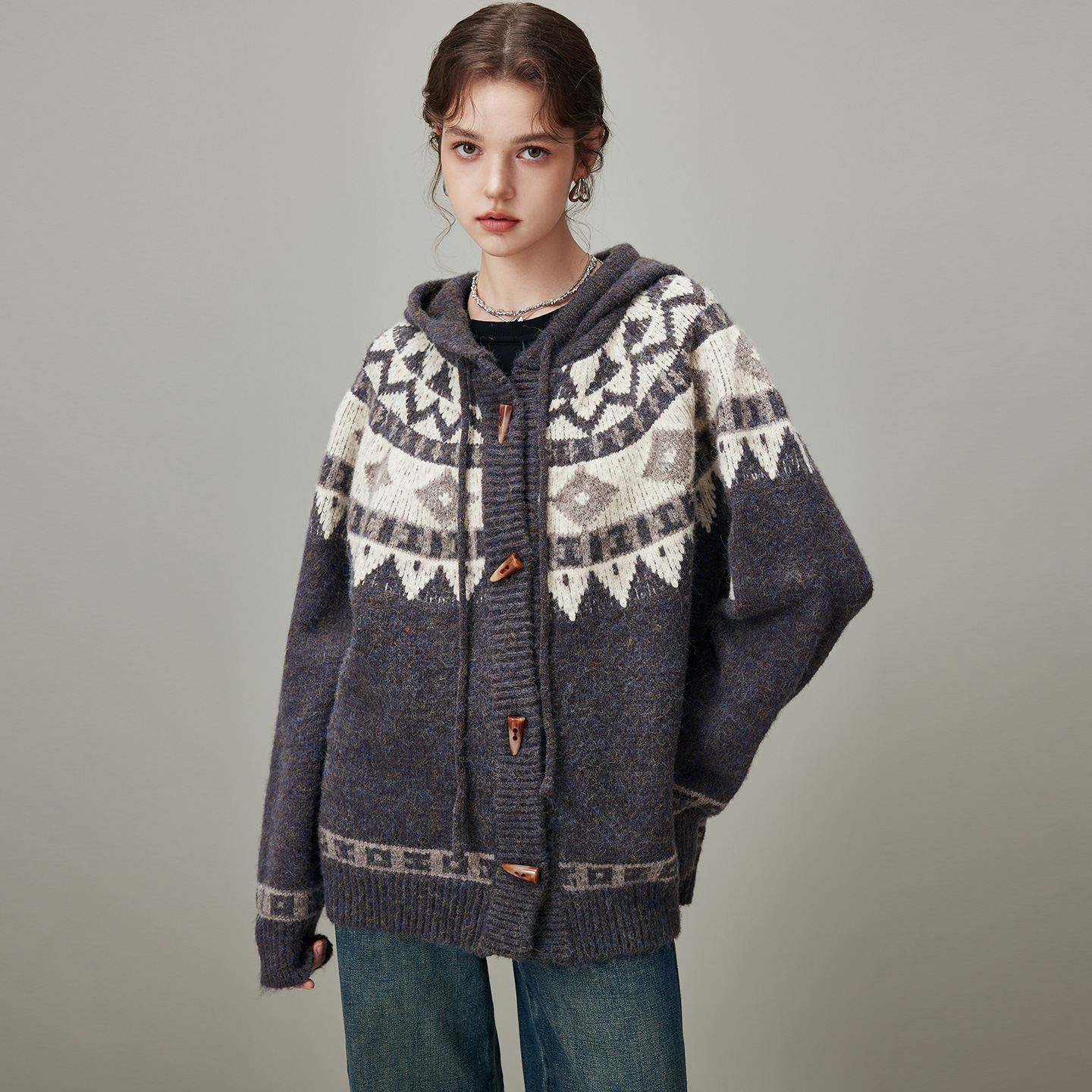 连帽宽松开衫 新款 毛衣 针织外套女2025年冬季 dfvc费尔岛提花中长款