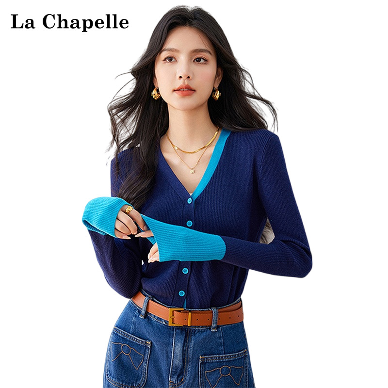 正肩多巴胺长袖 拉夏贝尔韩系撞色V领针织衫 时尚 新款 毛衣 女秋季