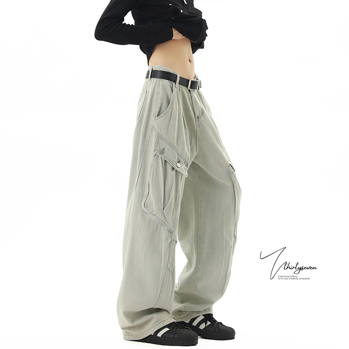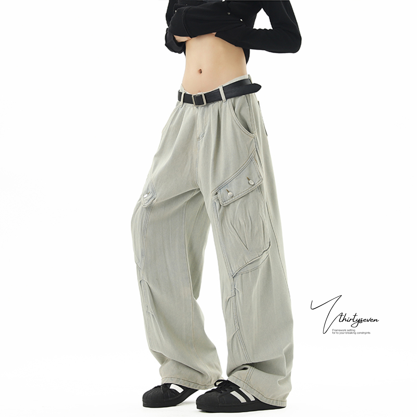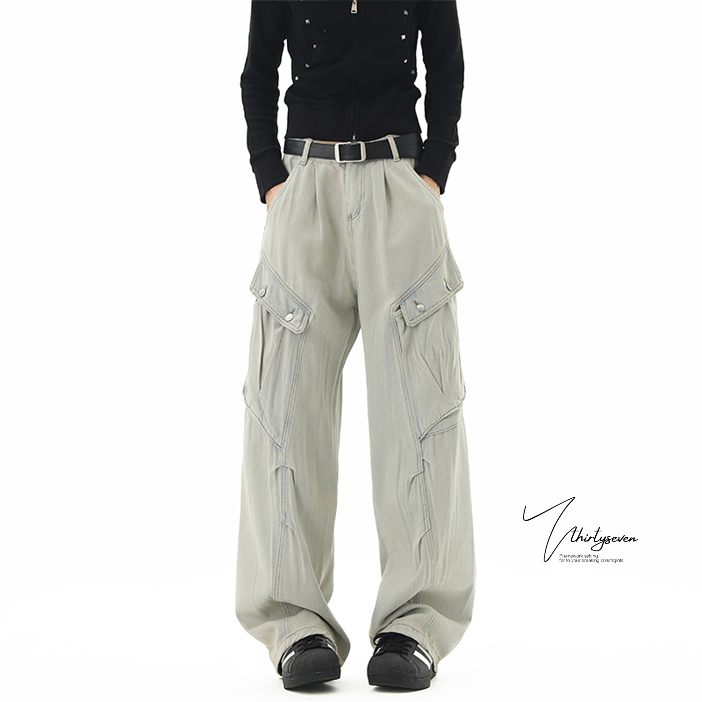 潮牌设计感cleanfit直筒阔腿裤 男秋季 高街褶皱做旧牛仔裤 V37美式