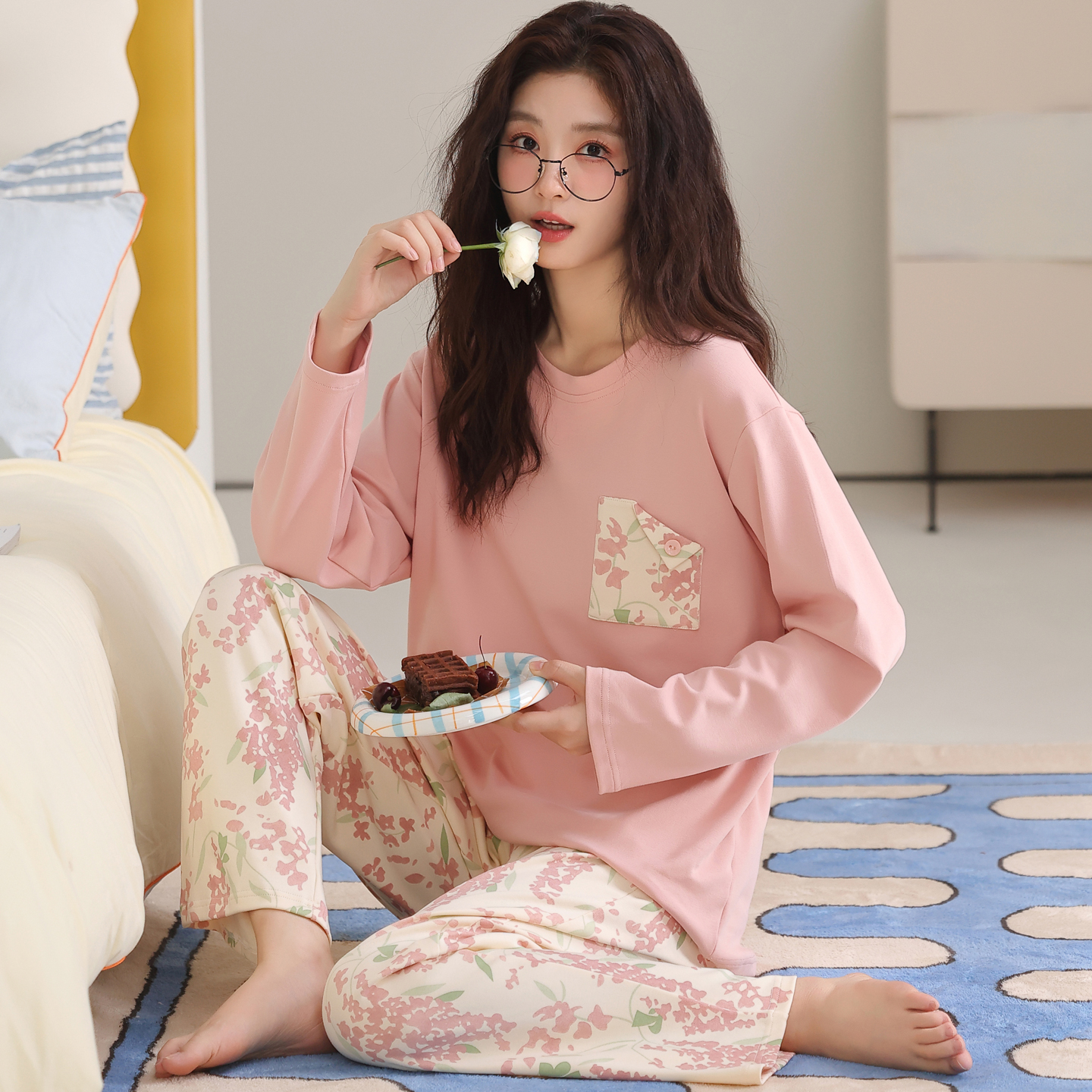 全棉休闲家居服套装 带胸垫长袖 秋春2025新款 都市丽人纯棉睡衣女款
