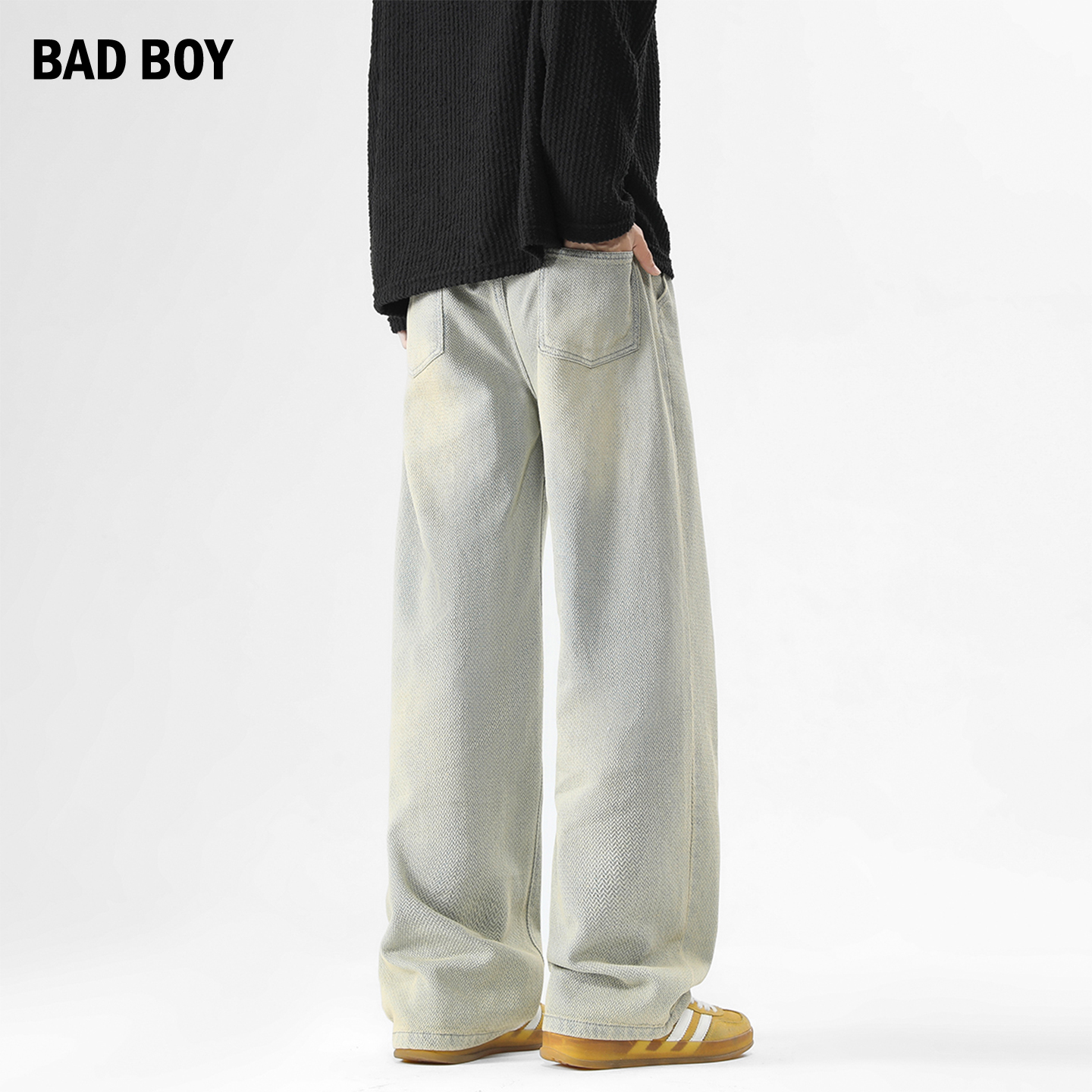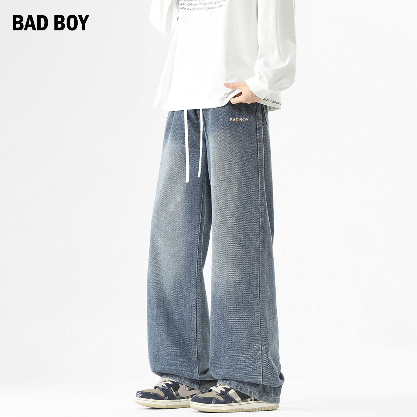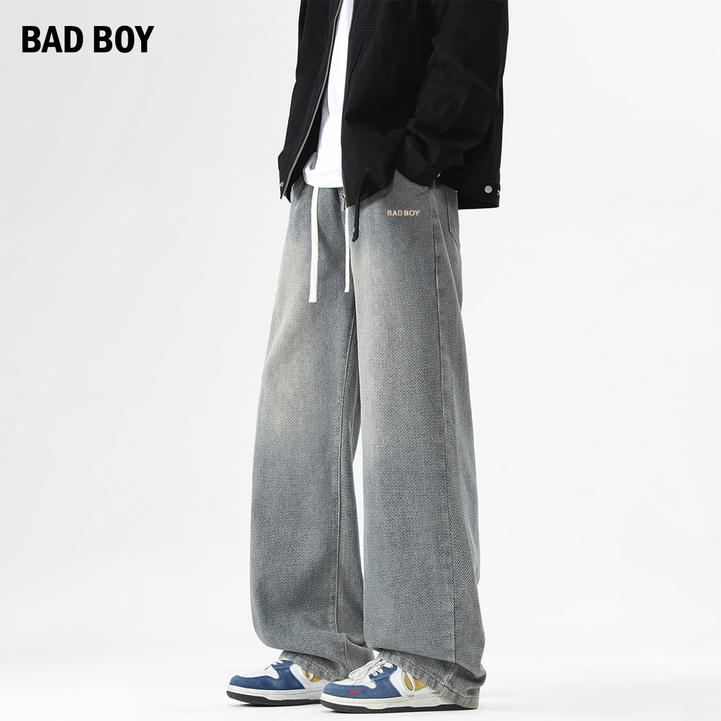 子 男秋潮牌青少年水洗宽松直筒裤 V37美式 侧边织带条纹拼接牛仔裤