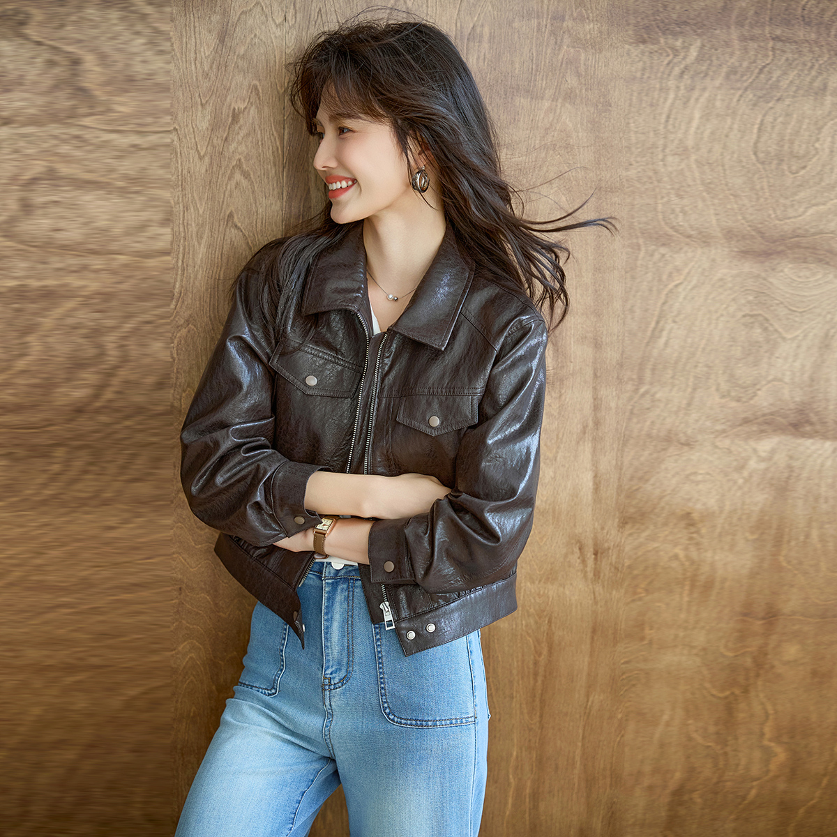 高级感甜酷短款 新款 夹克外套 口袋复古棕色皮衣女2025年秋季 妖精