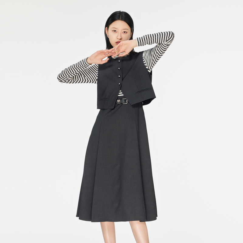 气质马甲通勤两件套 法式 飘蕾Peoleo条纹连体长裙套装 2025秋冬新款
