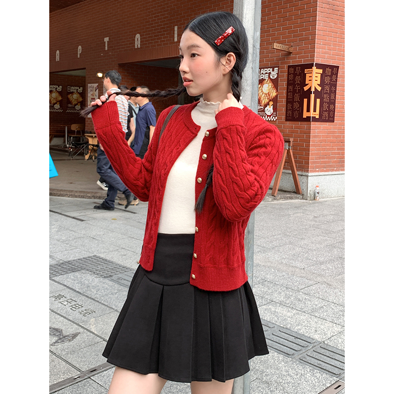 时尚 NOA真维斯红色绞花开衫 新款 2025秋冬季 洋气小香风外套 毛衣女