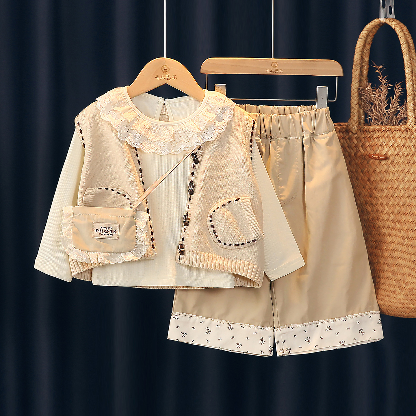 套装 叠穿内搭T恤木耳边牛仔阔腿裤 新款 蓝色镂空针织背心裙女秋季