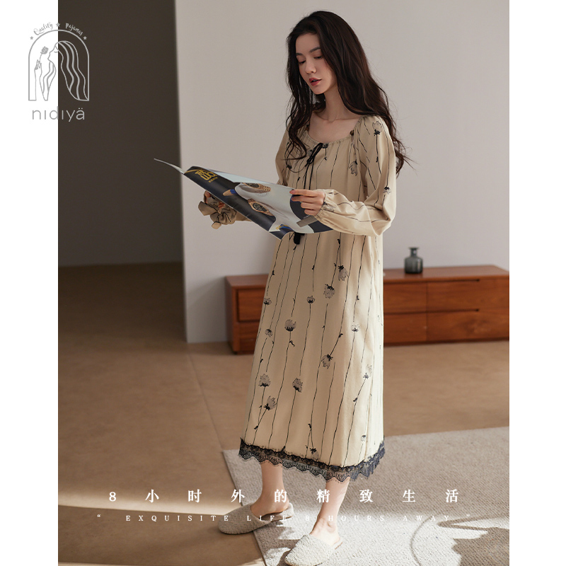 法式 柔软棉复古中长裙春秋季 气质家居服 长袖 妮狄娅睡衣睡裙女秋季