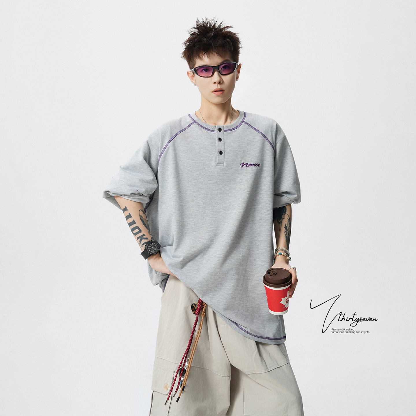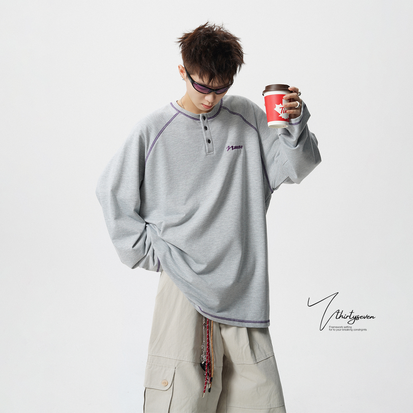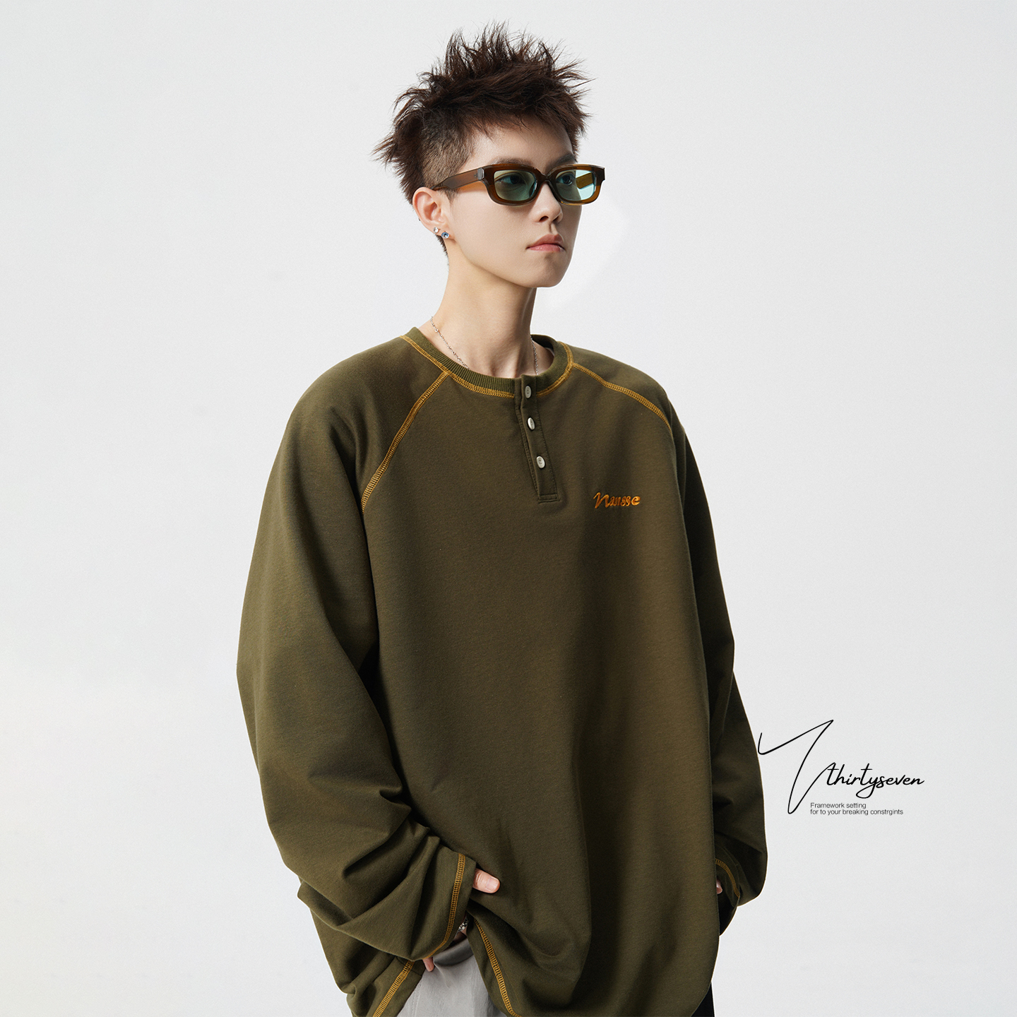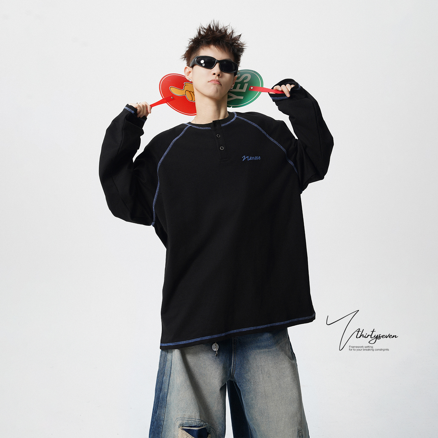 V37美式 潮牌休闲宽松情侣外套上衣 复古撞色拼接亨利领卫衣男秋季