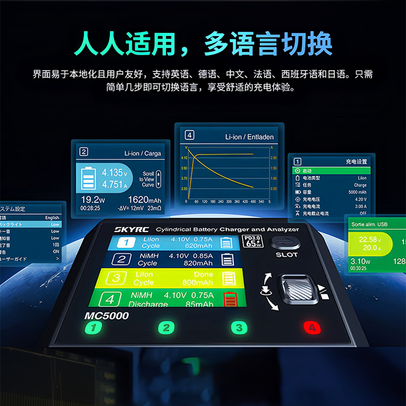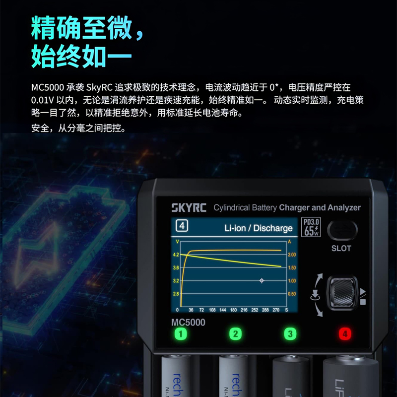 SKYRC 单槽独立工作手机可连多语言切换 MC5000圆柱型电池充电器支持多电池类型充电存储放电循环更新活化模式
