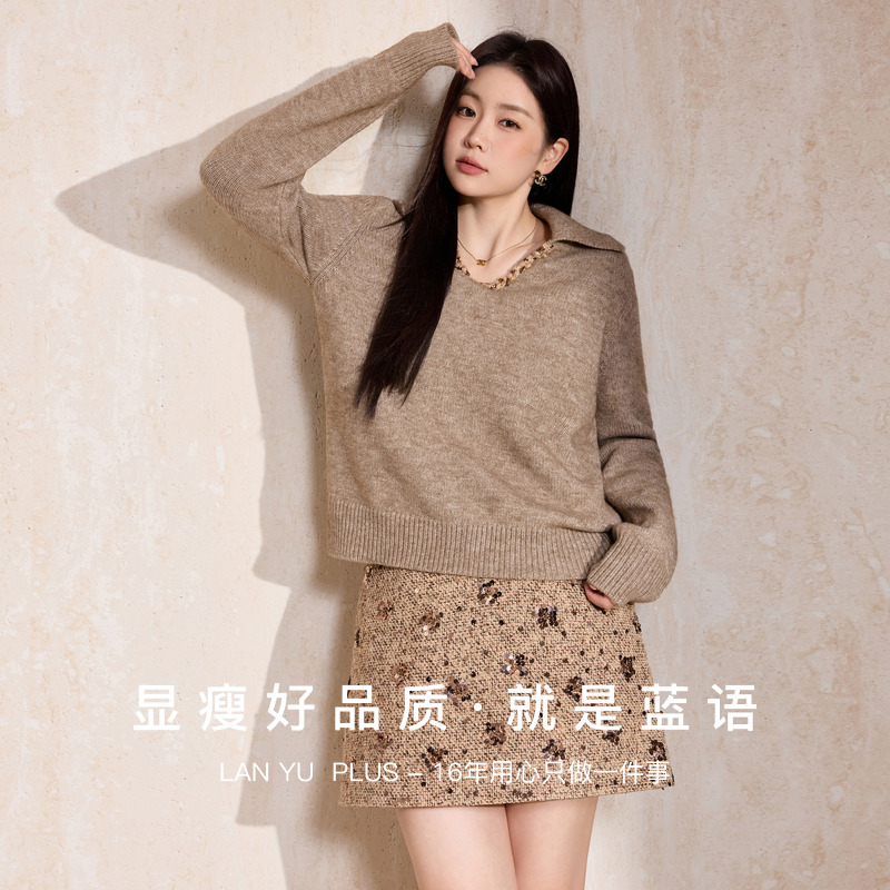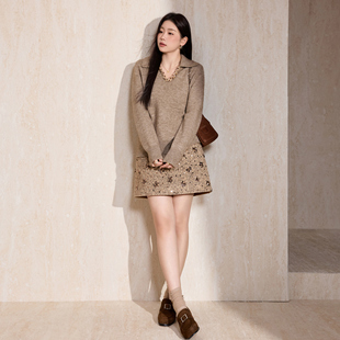 2025新品 重工编织宽松翻领毛衣亮片绣花A字短裙套装 女装 蓝语大码