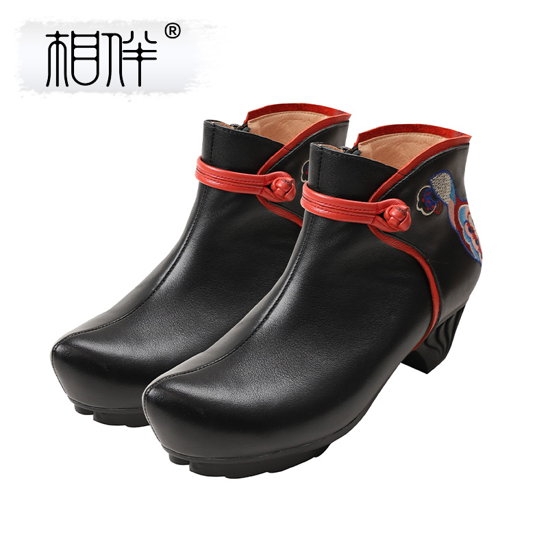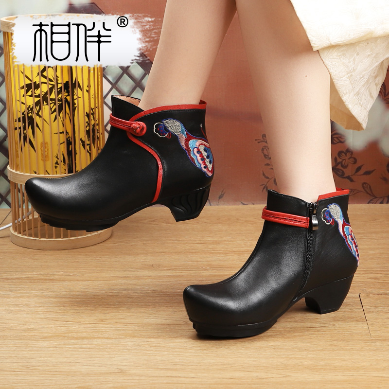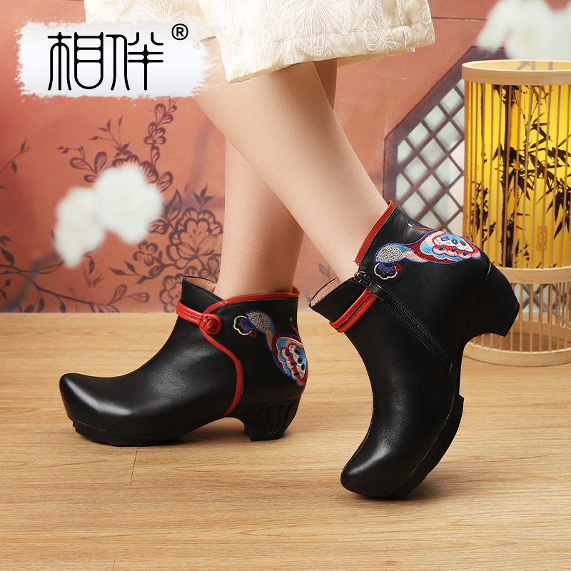 相伴真皮短靴女2025春秋单靴新款 翘头厚底绣花粗跟民族风原创女靴