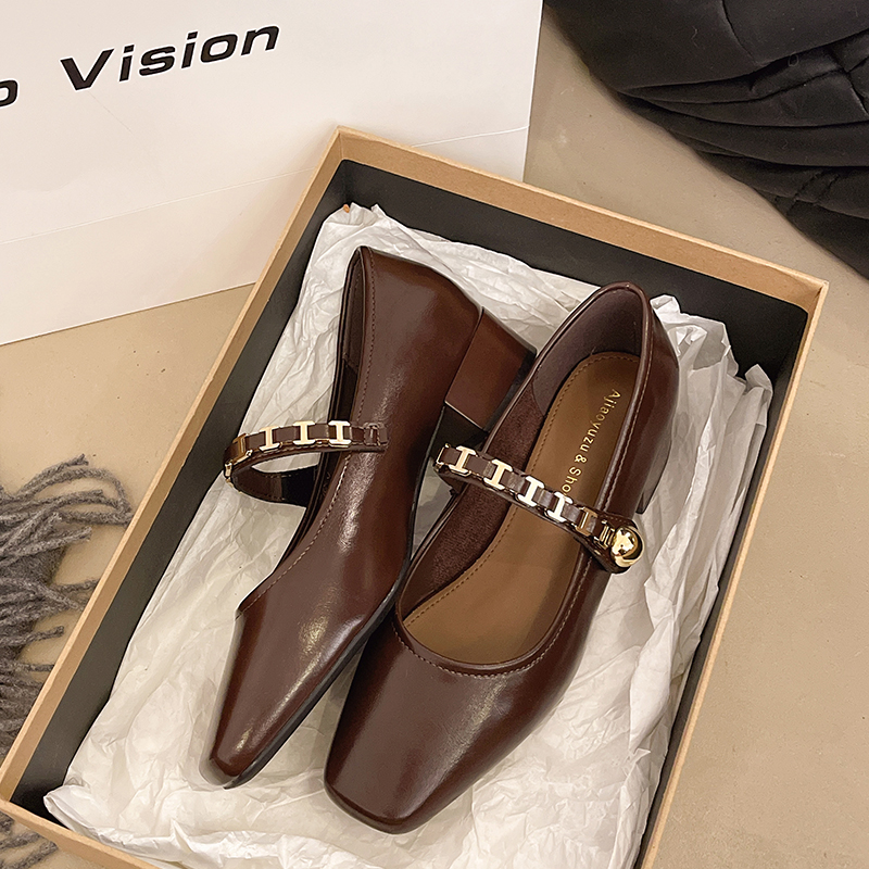 百搭一字带小皮鞋 法式 粗跟浅口单鞋 女春时尚 软面 复古方头玛丽珍鞋