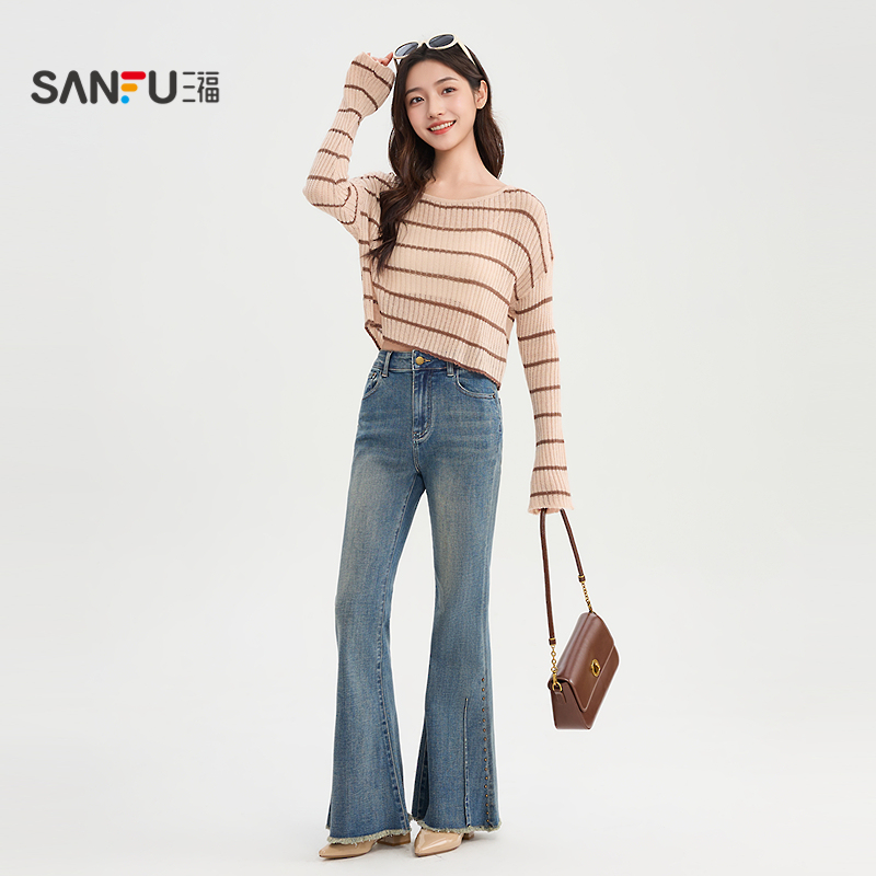 三福牛仔长裤 子女装 2025秋季 脚复古喇叭裤 504897 铆钉毛边裤