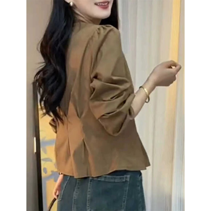 女法式 秋季 泡泡袖 衬衫 胖mm显瘦收腰高级感V领上衣 遮肚子长袖 大码