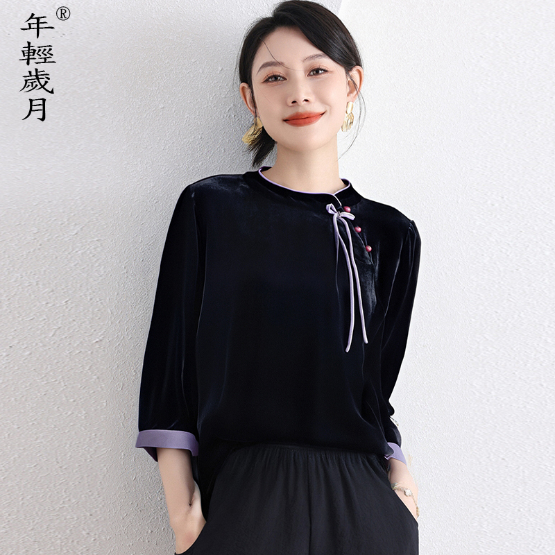 纯色遮肉显瘦外套 桑蚕丝新中式 真丝丝绒上衣女2025春秋新款 七分袖