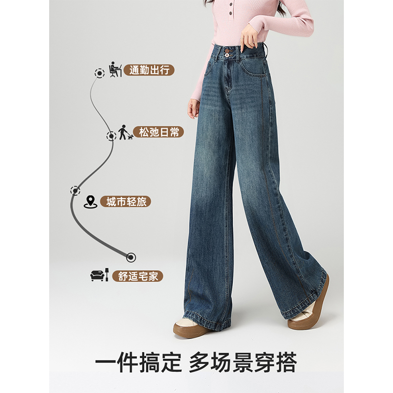 子女 百搭休闲通勤牛仔蓝阔腿长裤 POLOWALK女士直筒牛仔裤 秋冬新款