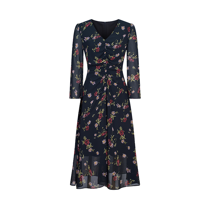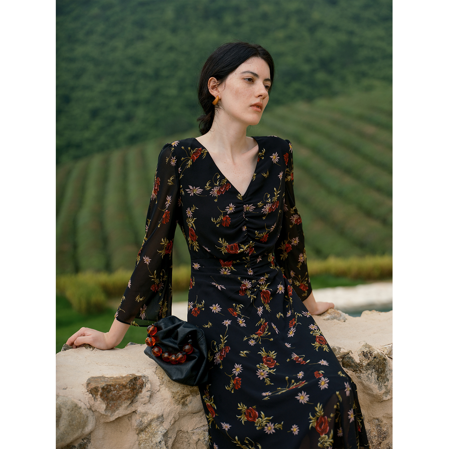 碎花连衣裙女秋季 HeyDress 法式 诗 气质V领显瘦长裙子 藤与花