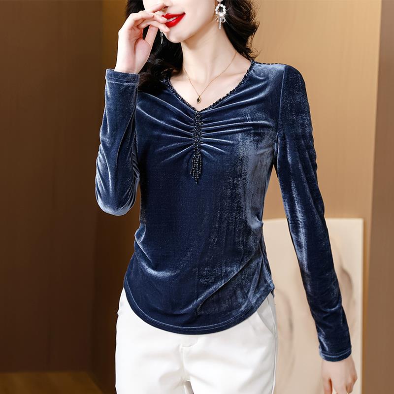 秋冬V领高贵褶皱t恤上衣女士高端奢华洋气妈妈内搭金丝绒打1020z