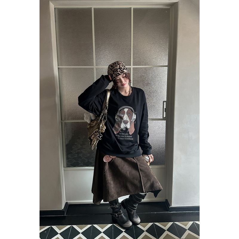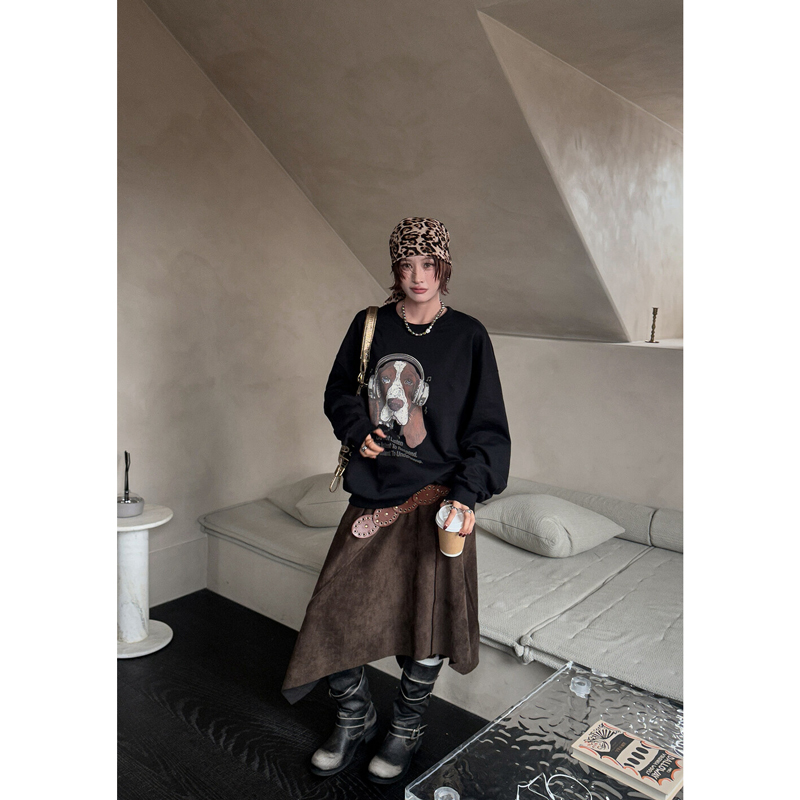 做旧耳机小狗印花卫衣2025秋冬圆领复古中长款 情侣加绒潮牌长袖