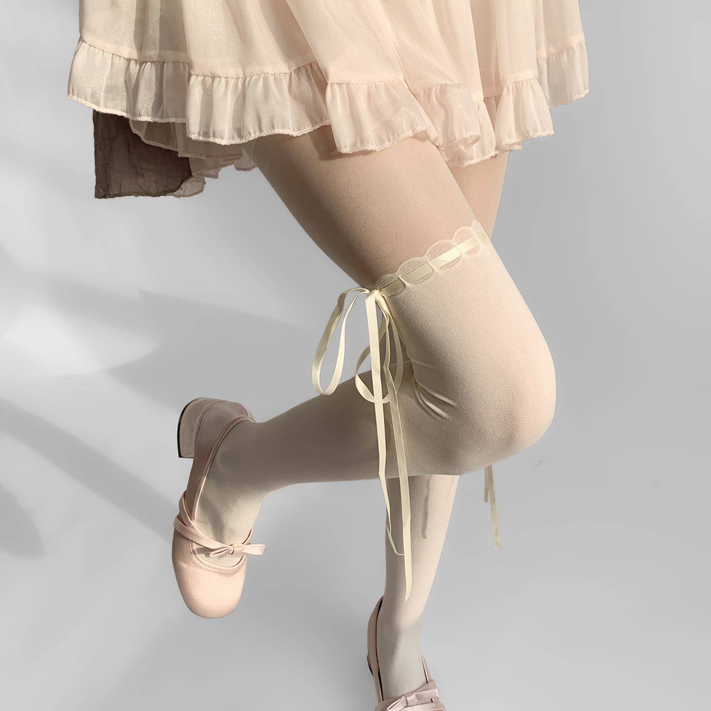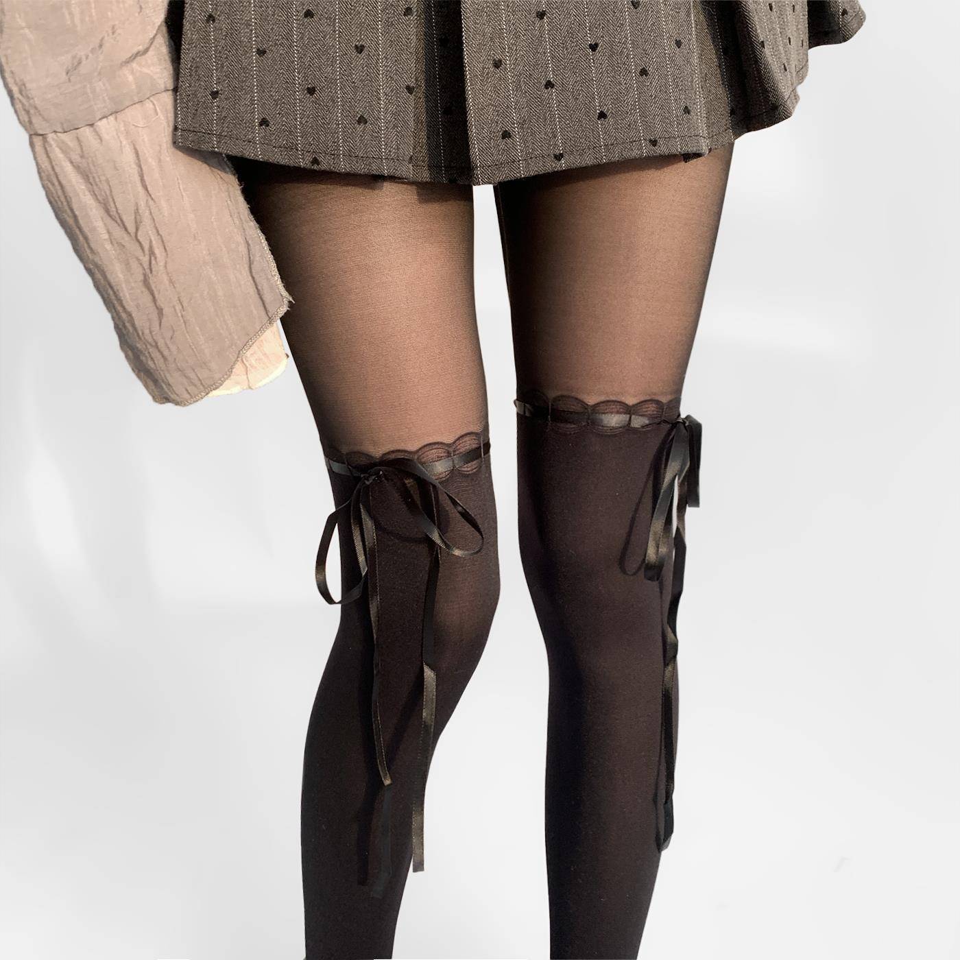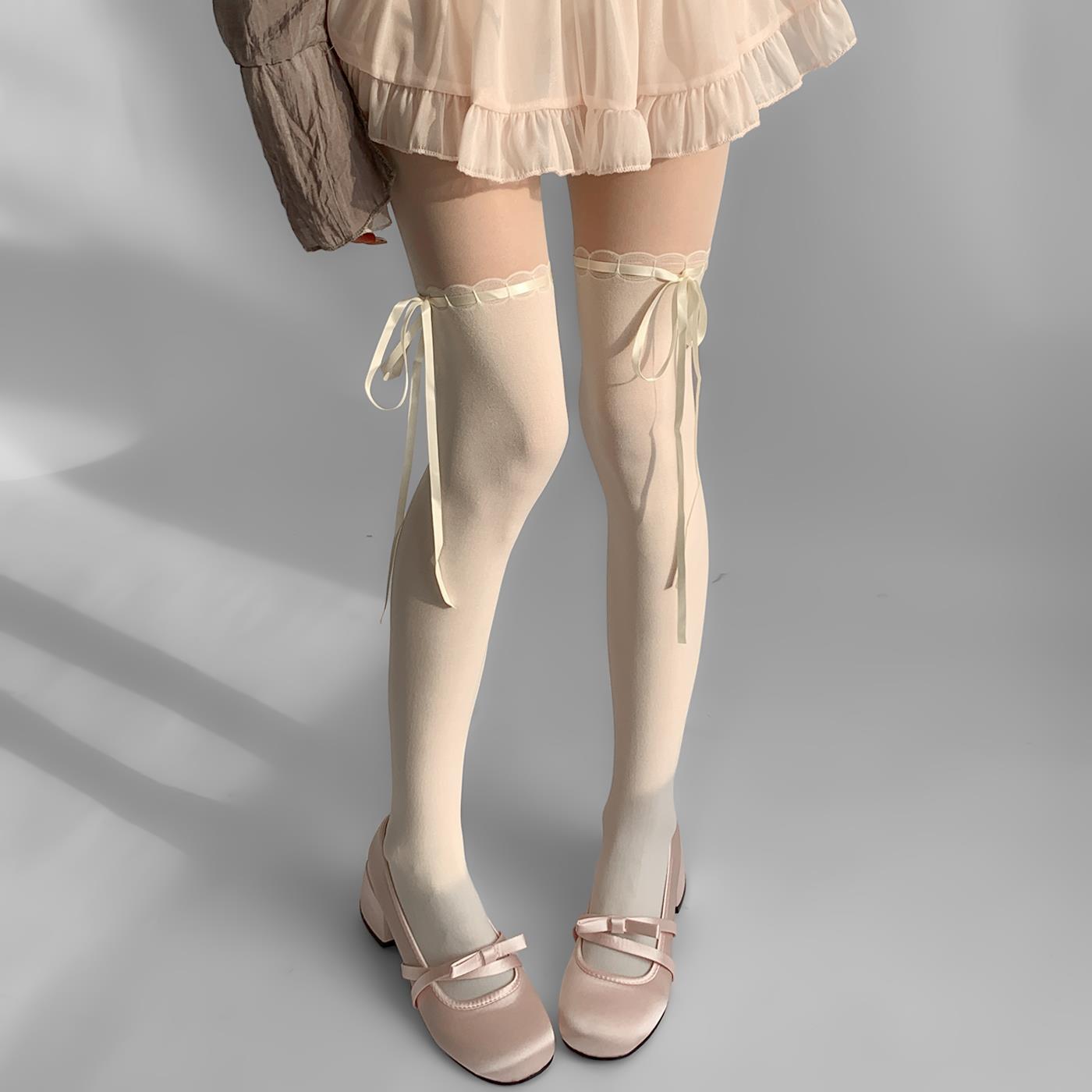 夜间教习室蕾丝拼接丝袜女天鹅绒连裤 袜秋冬蝴蝶结绑带白丝打底裤
