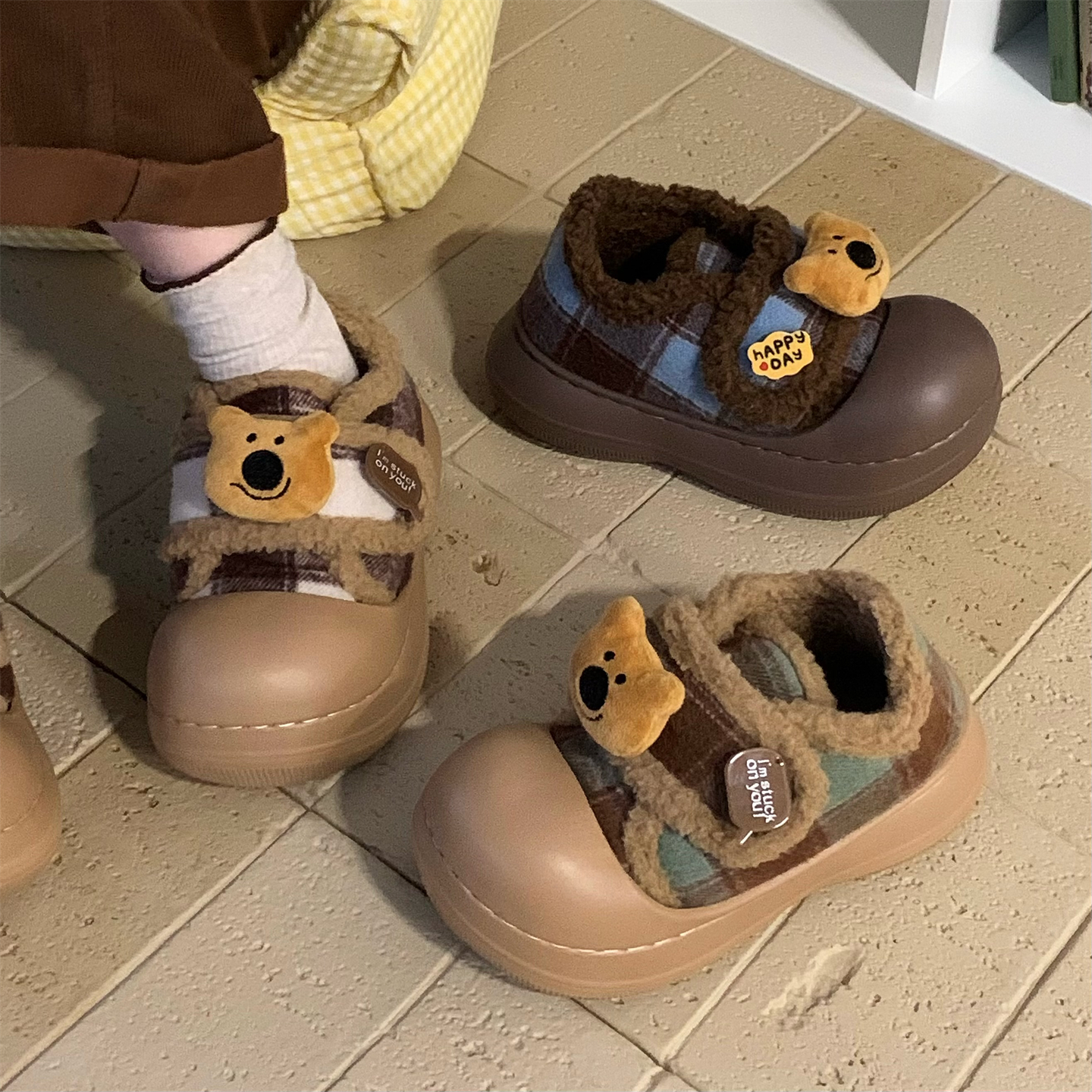 外穿防滑少女心厚底亲子面包鞋 魔术贴可爱黑鼻小熊毛毛棉鞋 女冬季