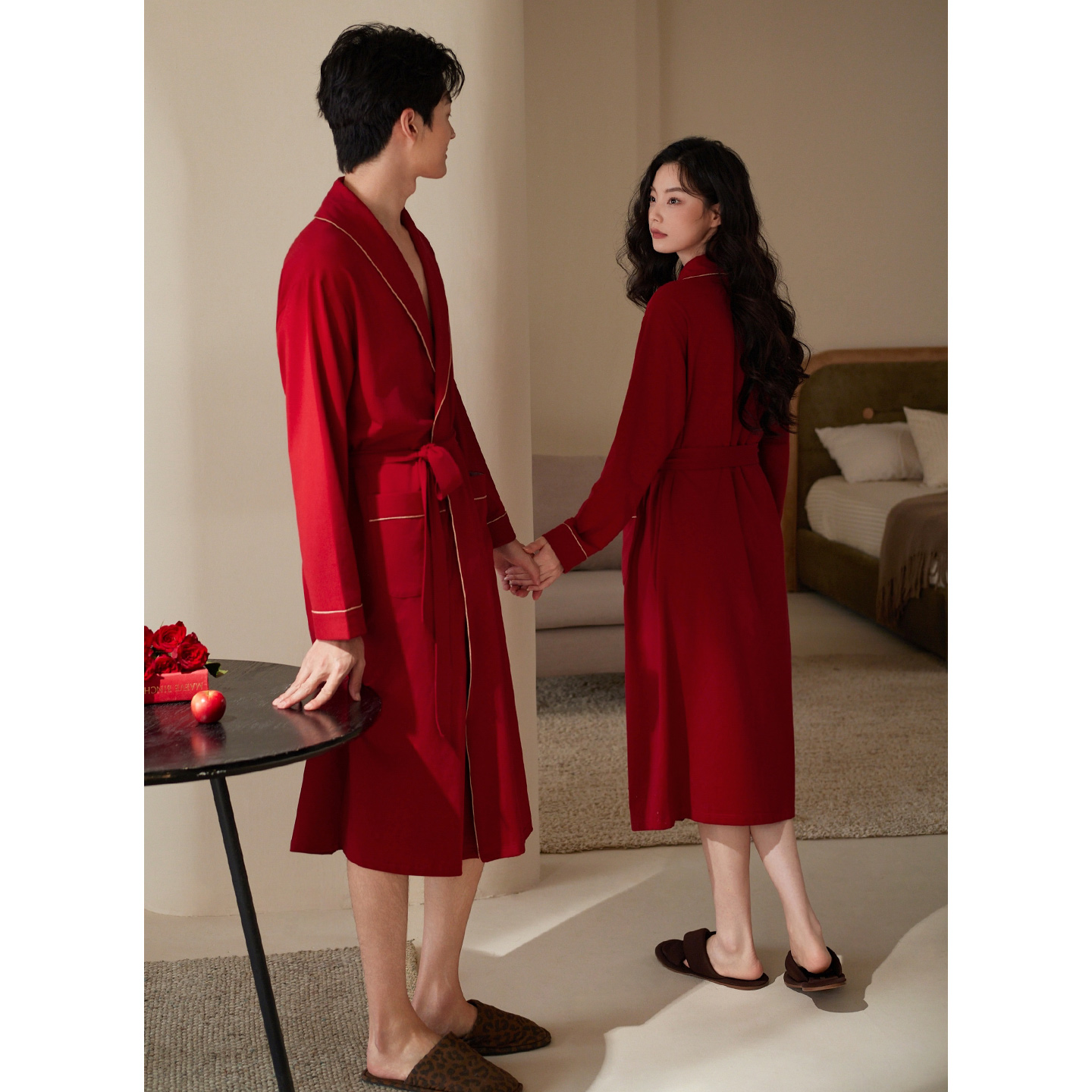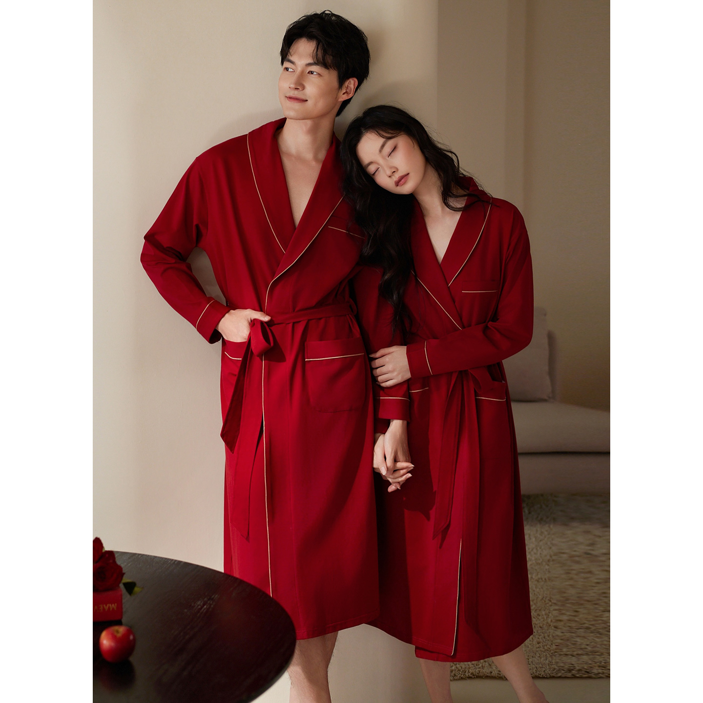 新婚结婚浴衣 浴袍睡衣大红色本命年男士 情侣睡袍女春秋款 纯棉长袖
