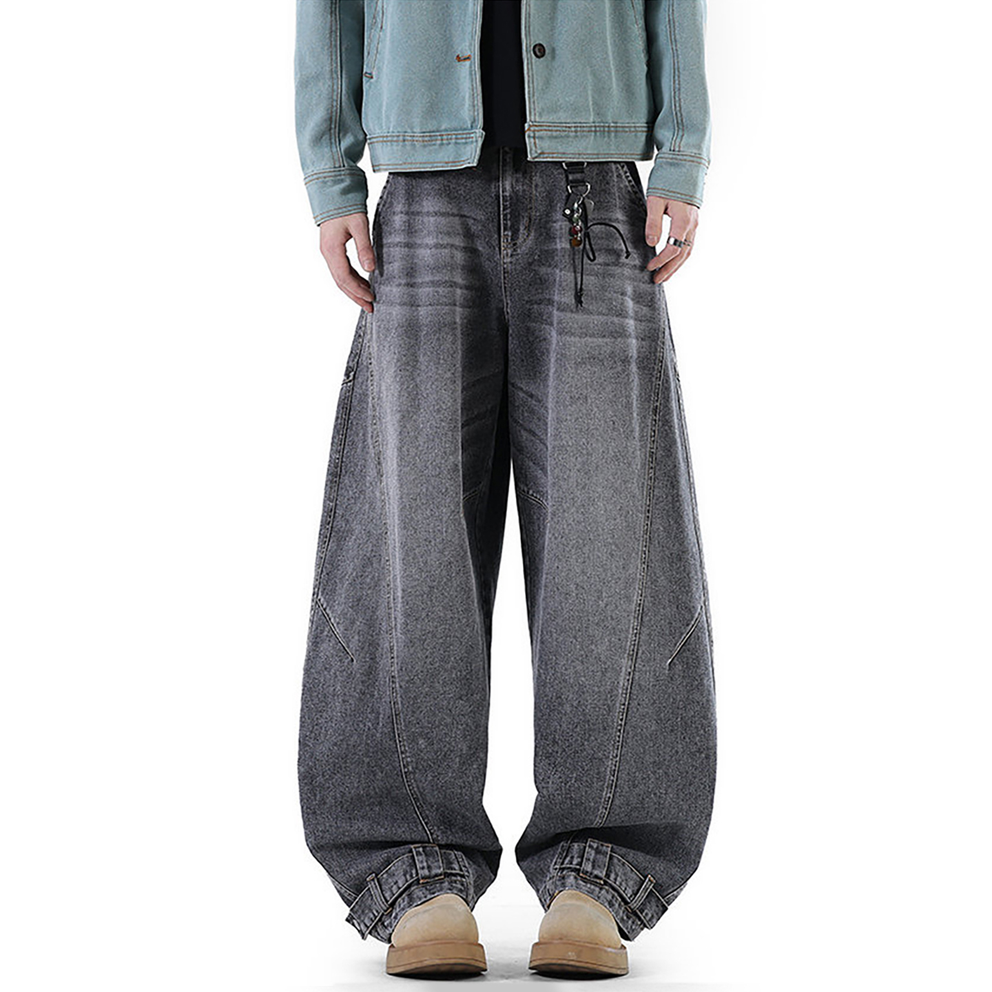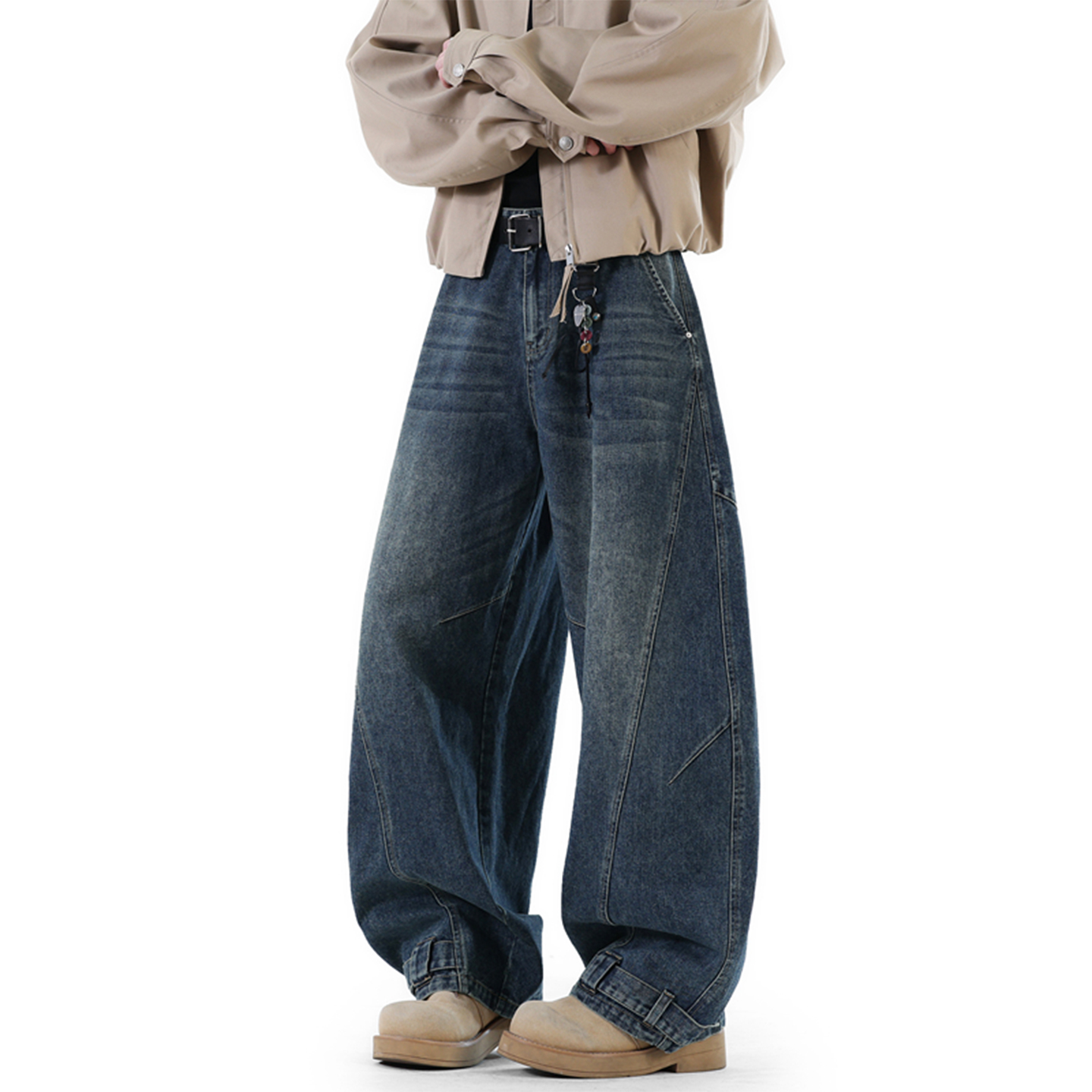 潮牌复古宽松阔腿弯刀长裤 男生秋季 子 水洗做旧解构拼接牛仔裤 美式