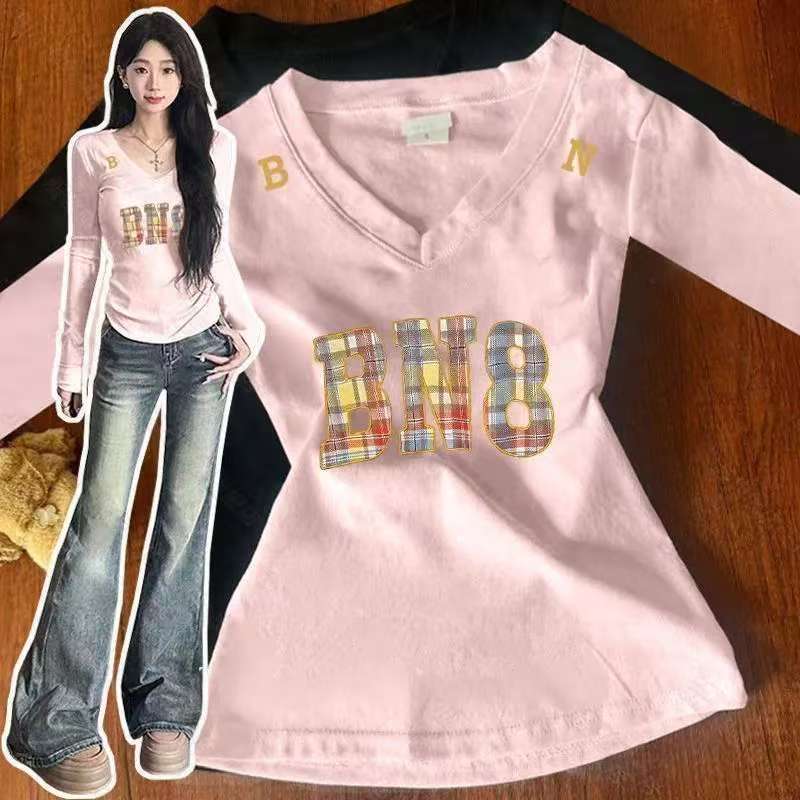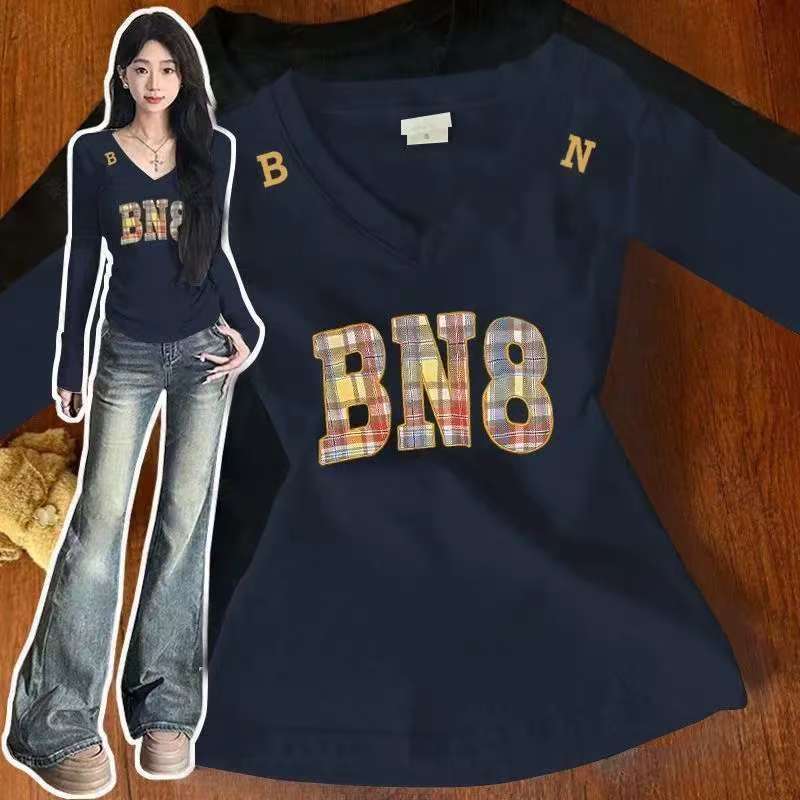 百搭修身 V领正肩T恤女2025春秋白色时尚 上衣学生潮流 复古长袖 美式