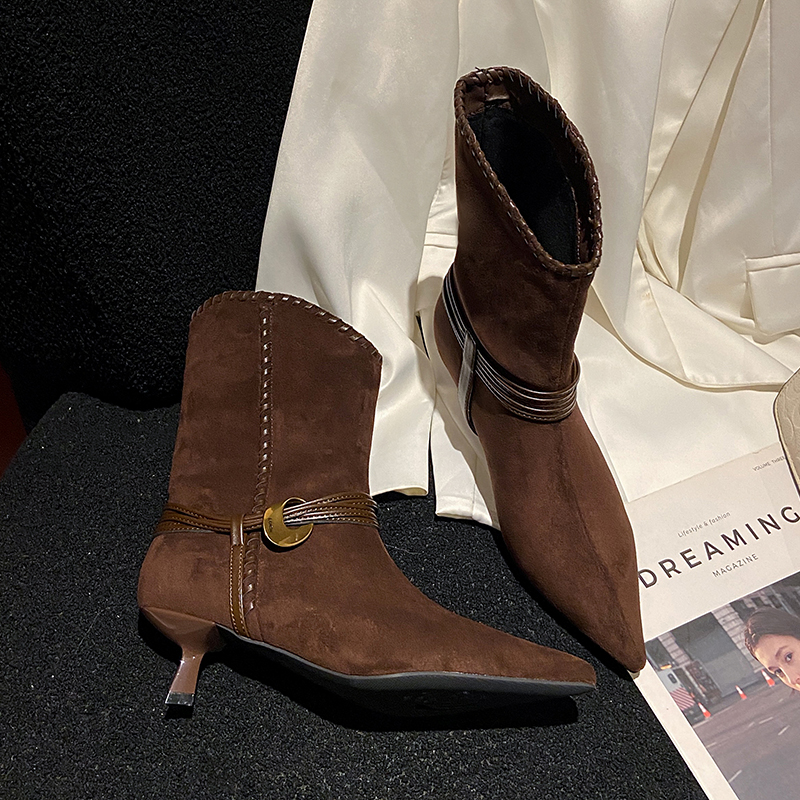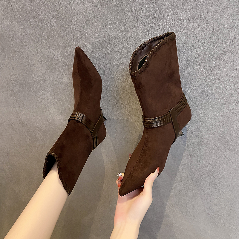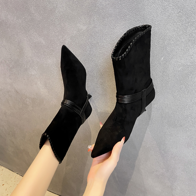 2025春秋新款 靴瘦瘦靴女 西部风尖头绒面短靴细跟低跟百搭绑带时装