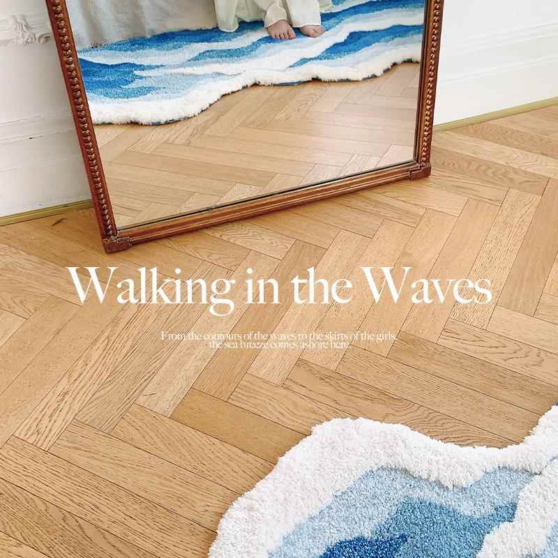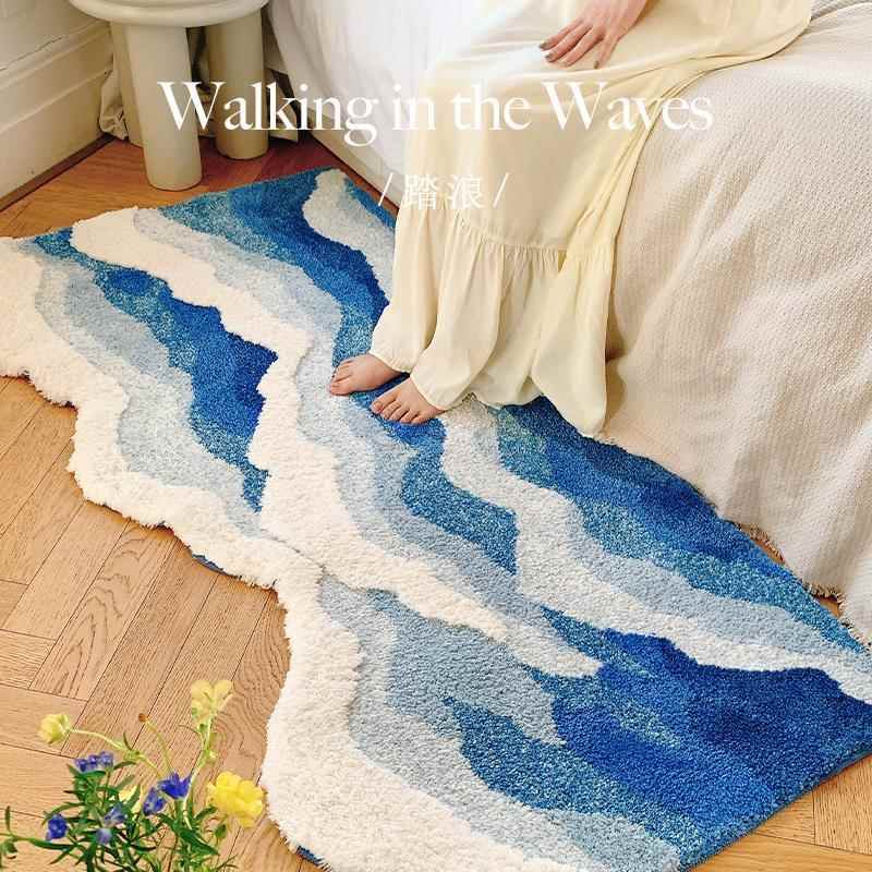 蓝色海浪卧室床边地毯加厚房间装 饰布置出租屋网红沙发长条地垫