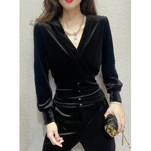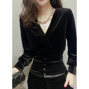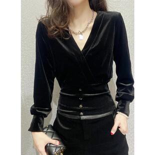 打底衫 上衣V领修身 1012z 女内搭黑色收腰高端感长袖 秋冬金丝绒衬衫