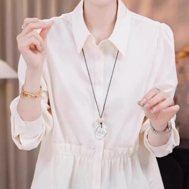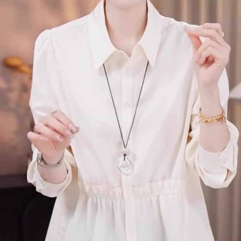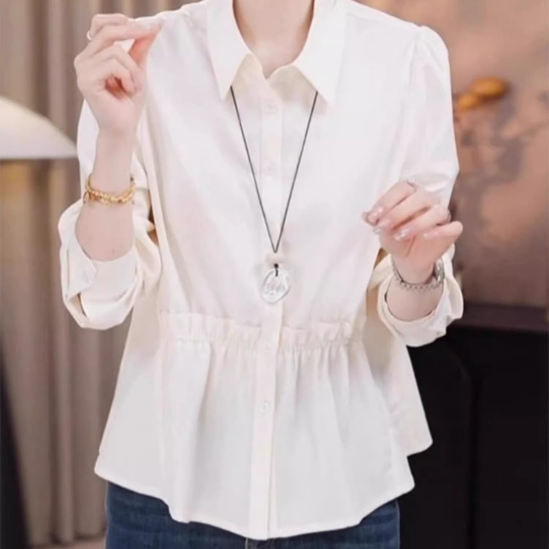 设计感大码 白色荷叶边长袖 新款 女士2025秋季 胖mm抽褶收腰衬衣 衬衫