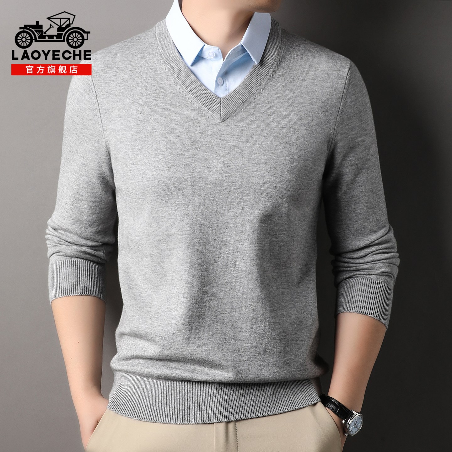 圆领100%纯山羊绒衫 灰色宽松打底上衣 女毛衣秋冬假两件拼色针织衫