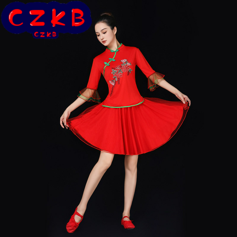 新款 服中老年女古典舞民族舞蹈服大红喜庆中国风表演服套装